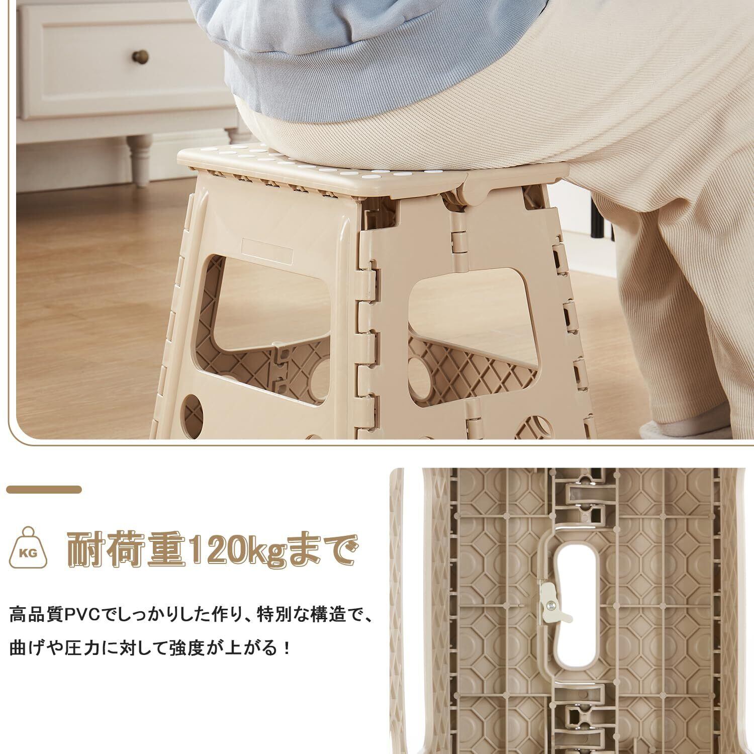 【滑り止め付き】天板と底に滑り止めゴムを配置しスツールから、ノンスリップ機能で安定性を保てる折りたたみ踏み台です。【耐荷重120kg】特別な格子状の構造で、丈夫で壊れにくく、耐荷重は120kgまで、大人が乗っても丈夫な脚立です。