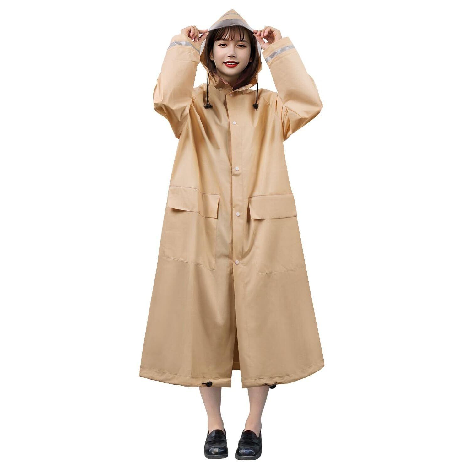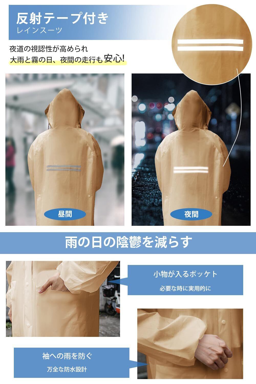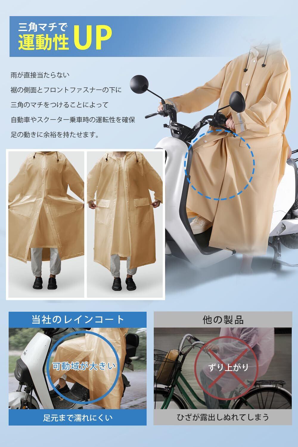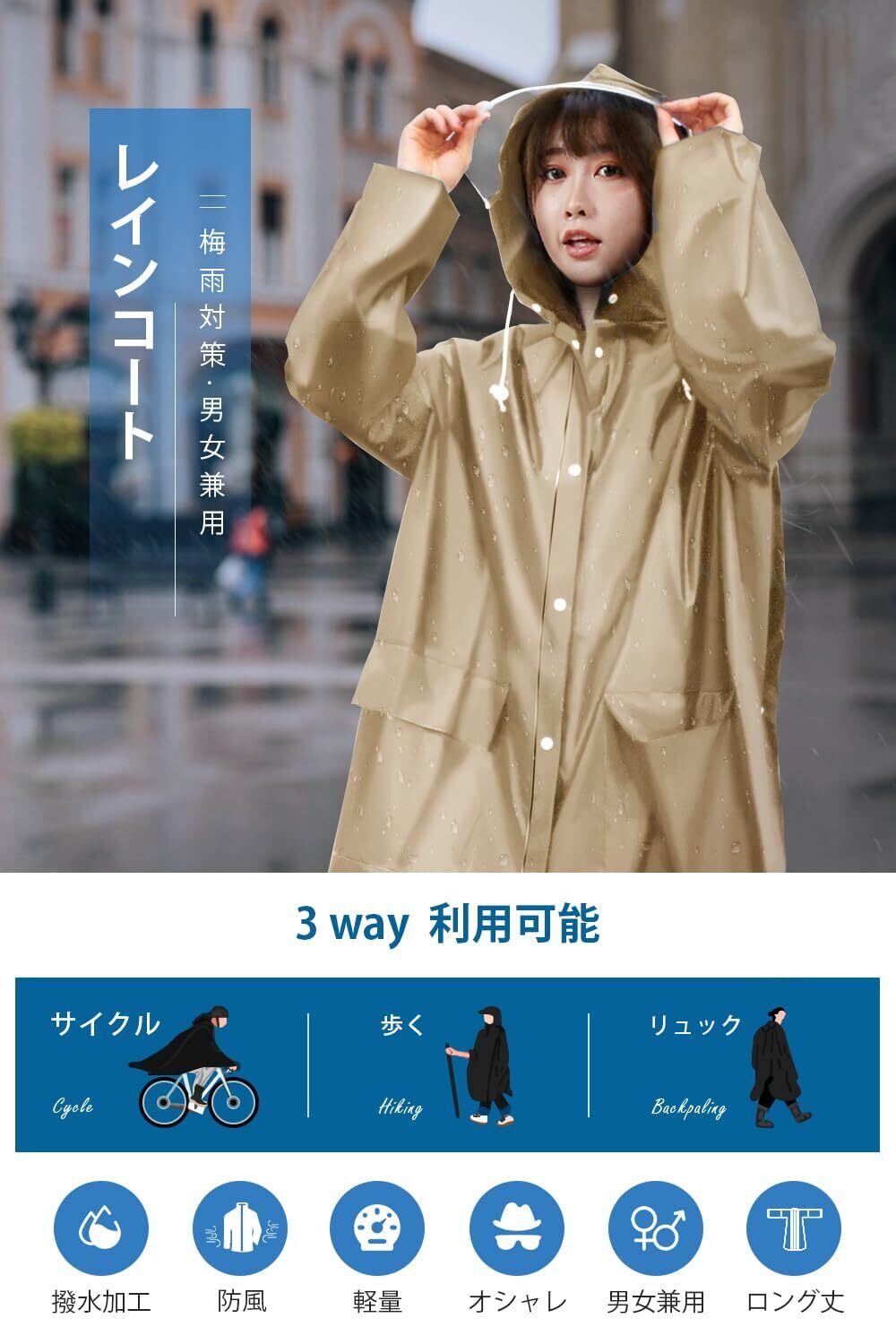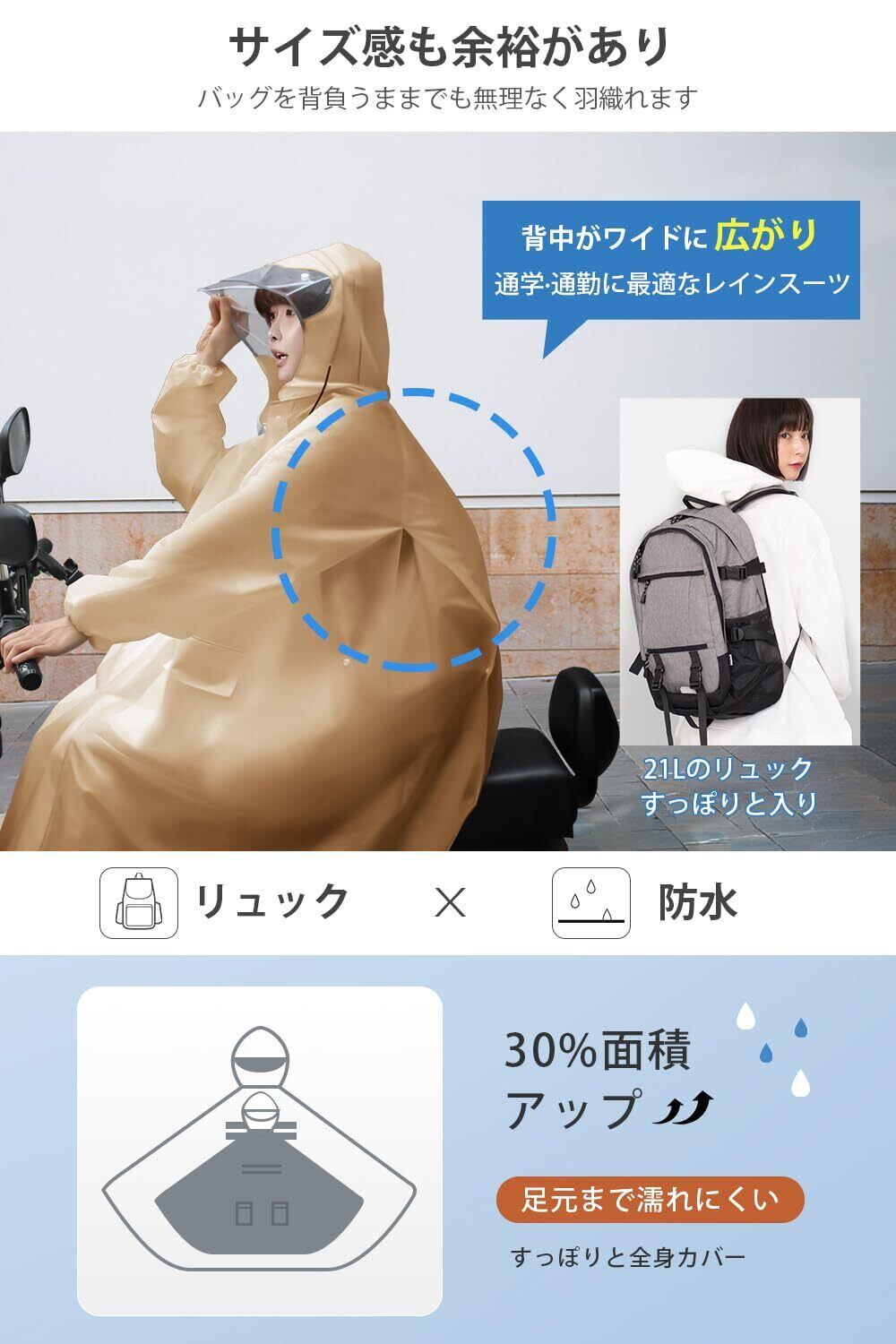 【男女兼用大きめサイズ】街歩きはもちろん、自転車、バイク、原付き運転にも対応可能なレインコートです。背中のスナップボタンを開けると、リュックを背負っても余裕に使える大きいサイズに広がり、膝下までカバーするロング丈に加え、体をすっぽり覆い、雨から守りながら、窮屈さがなく動きやすい。通勤通学に最適なレインポンチョで、台風対策、梅雨対策として大活躍。