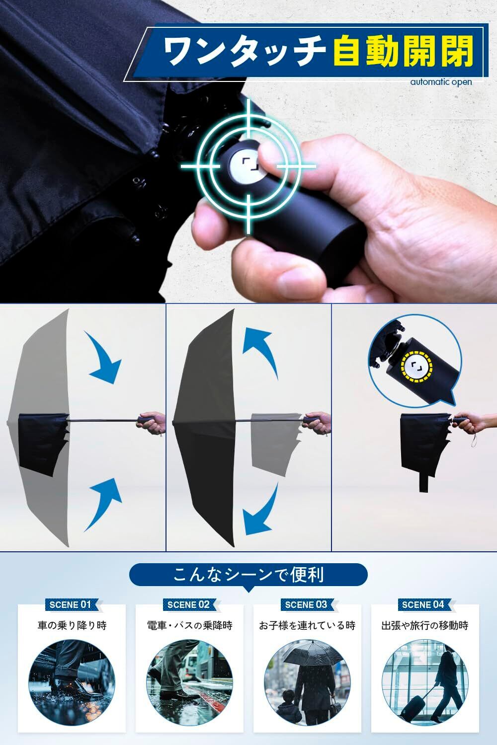 【逆戻り防止機能で安心設計】自動開閉傘にありがちな「骨の逆戻り」や「バネの飛び出し」を防ぐ、逆戻り防止機能(リバウンドガード)を搭載。使用中に不意に骨が飛び出したり、指を挟んだりするリスクを減らした安心設計です。どなたでも安全に、スムーズに使えるよう細部まで配慮された構造が、毎日の使用をより快適にサポートします。