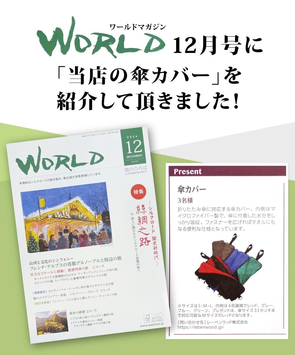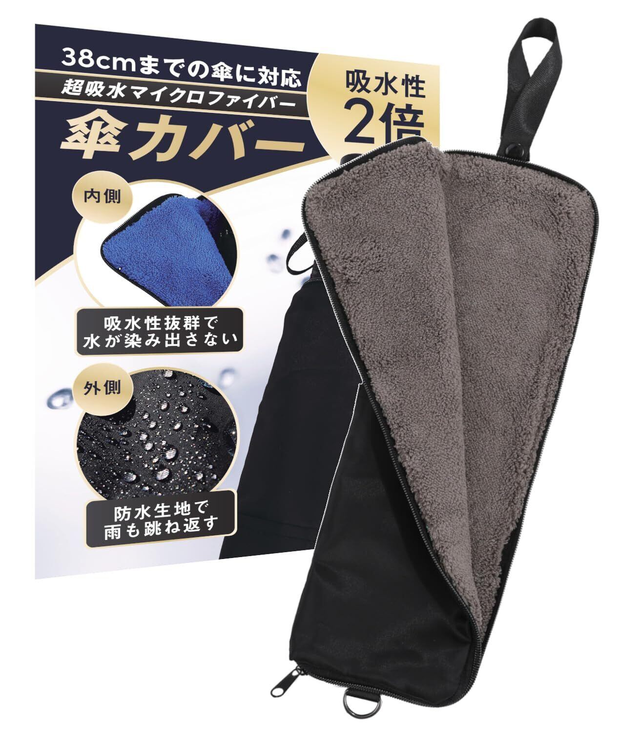 どんな折りたたみ傘にも対応する28/33/38cmのサイズ展開のある傘カバーです。中がマイクロファイバー製で、更に長さを当社過去の品より2倍にしてますので、傘に付着した水分をしっかり吸収します。傘のサイズに合わせて取っ手部分まで全て入るので傘から水が滴り落ちてくるという事もありません。