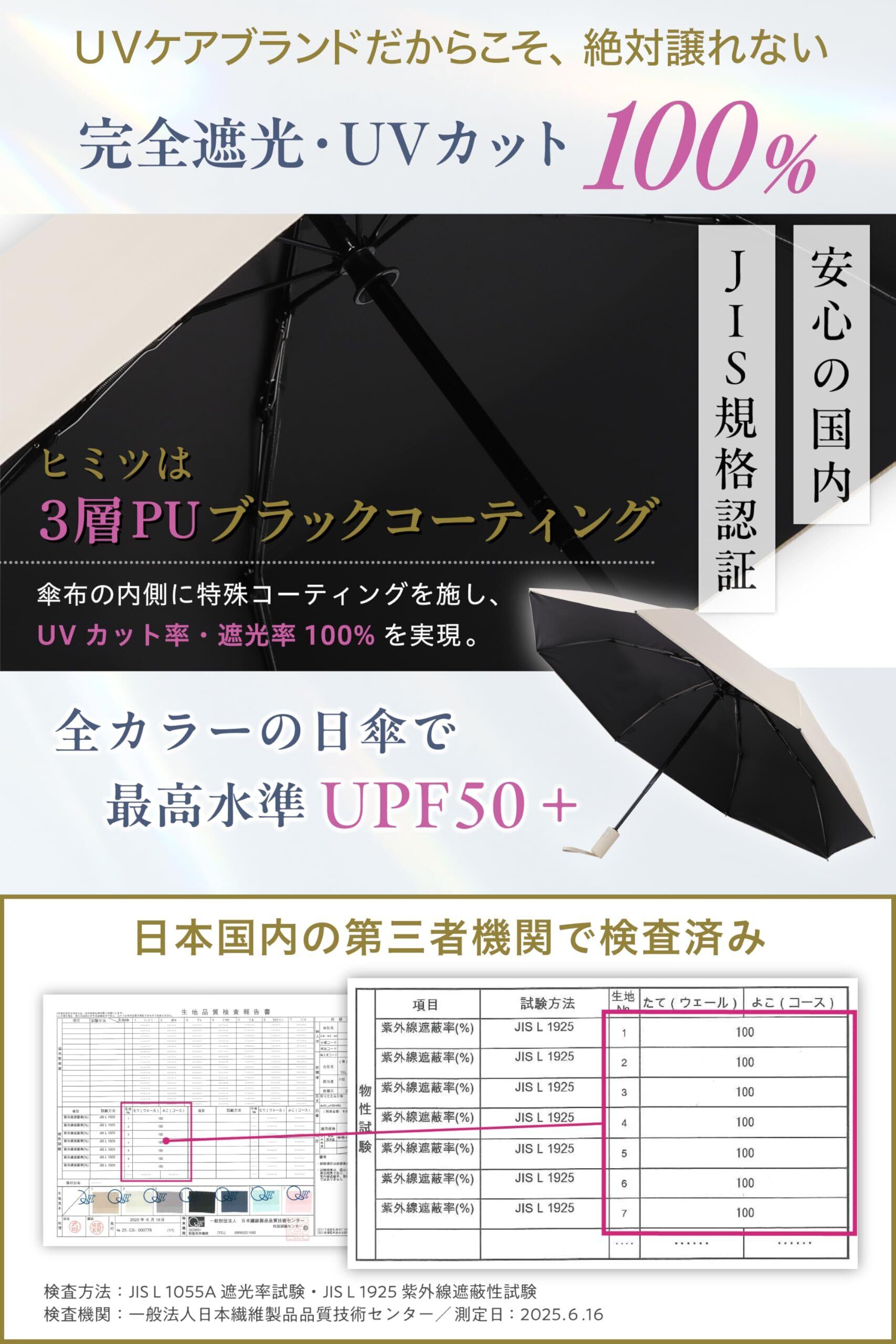 【国内第三者検査機関にてUVカット率100%の実証済】日本の国家規格、JIS規格1925にてUVカット率100%を実証。JIS規格1055にて遮光率100%の実証済み!完全遮光の最高級日傘です。