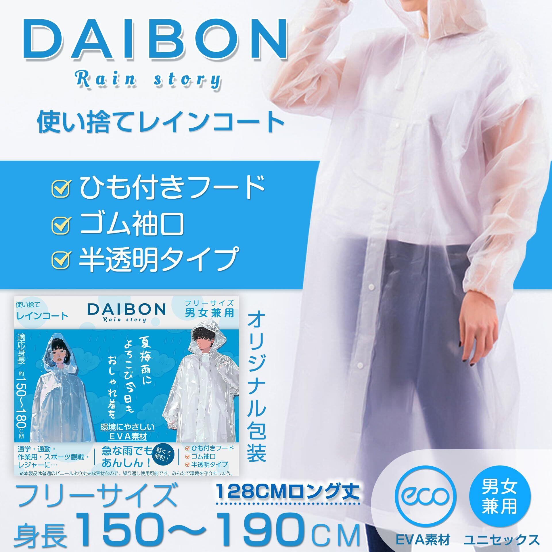 [DAIBON] レインコート 128cmロング丈改良 使い捨て 【環境にやさしいEVA素材】 ゴム袖口 ひも付きフード 雨合羽 台風対策 津波 スポーツ観戦 祭り レインポンチョ ユニセックス大人 レインウェア ワンサイズ 半透明タイプ