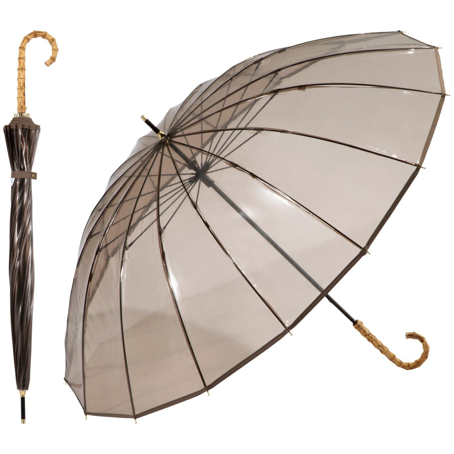 長傘 長雨傘 レディース 丈夫 おしゃれ ブランド 女性 長く使えるビニール傘 頑丈 バンブーハンドル 綺麗 透明 クリア シンプル かわいい かさ 可愛い 多骨傘 上品 丈夫 エレガント カジュアル スタイリッシュ ブラウン 茶色 ブルー 青 手開き 60cm スナップボタン 無地