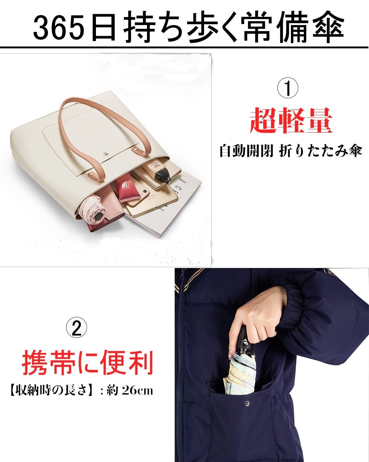 【自動開閉式折りたたみ傘】ワンタッチで自動開閉ができる日傘は、片手でも使え、とっさに傘を出して開ける際にはストレスがありません。車の乗り降りの際や、片手しかあいて無い時には大変便利です。普通な通勤用カバンや車に常備しておけば、緊急天候にも対応できます。