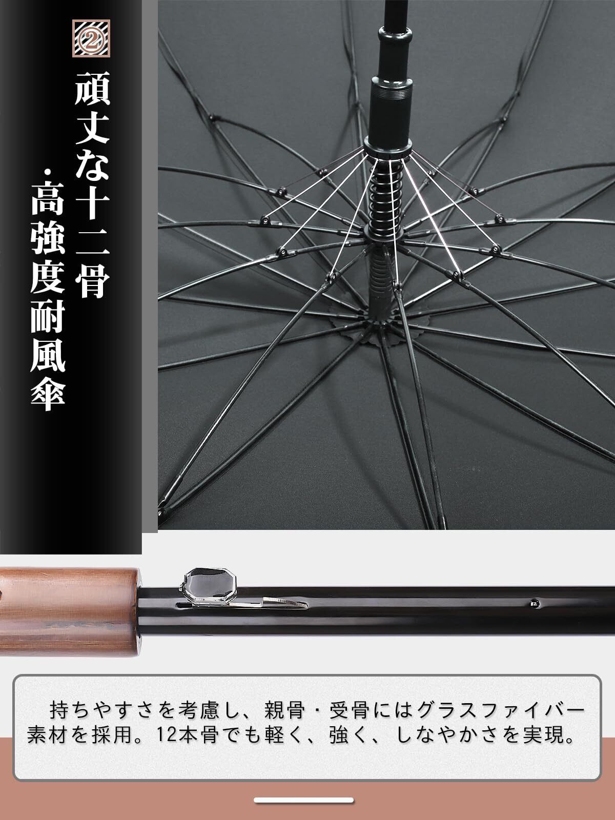 【激しい豪雨&台風対抗の頑丈な12本骨構造】暴風に応対性が強くなるため、骨組みに工夫を凝って頑丈なグラスファイバー製の12本の傘骨を採用しているのおかげで、アルミニウム合金製の傘より優れた耐風性を持っています。強い風でひっくり返っても、開閉スイッチを押したら、骨が曲がることなく、すぐ元通りになります。かなり耐久性に優れ、暴風雨、台風の天候でも容易に割れたり折れたりする心配がありません。耐久性が長くて安心して使える傘になります。