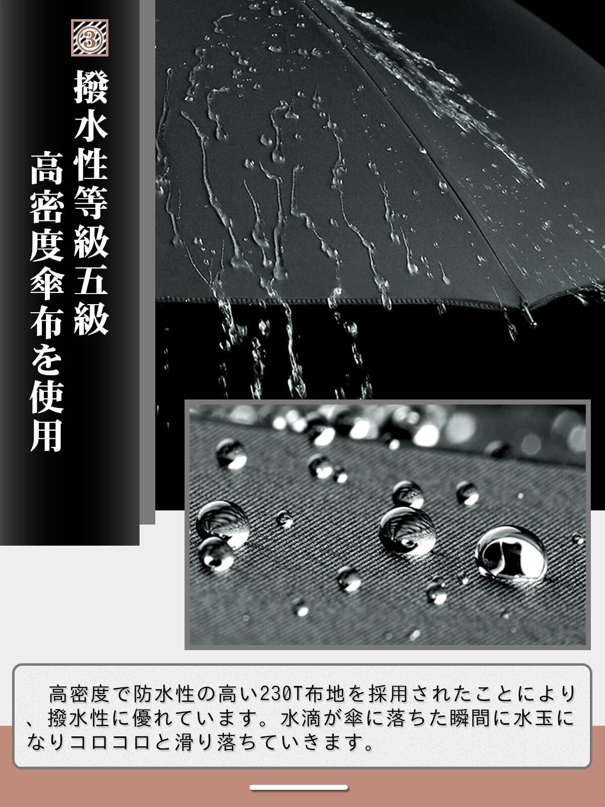 【撥水性等級5級】高密度で防水性の高いの230T防水布地を採用されたことにより、撥水性に優れています。水滴が傘に落ちた瞬間に水玉になりコロコロと滑り落ちていきます。また、汚れ防止の効果も有り、汚れには強い生地となります。丈夫な傘骨に合わせて激しい暴風雨にも対抗でき、水漏れや強風による割れなどの心配が全然有りません。長い間使えます。