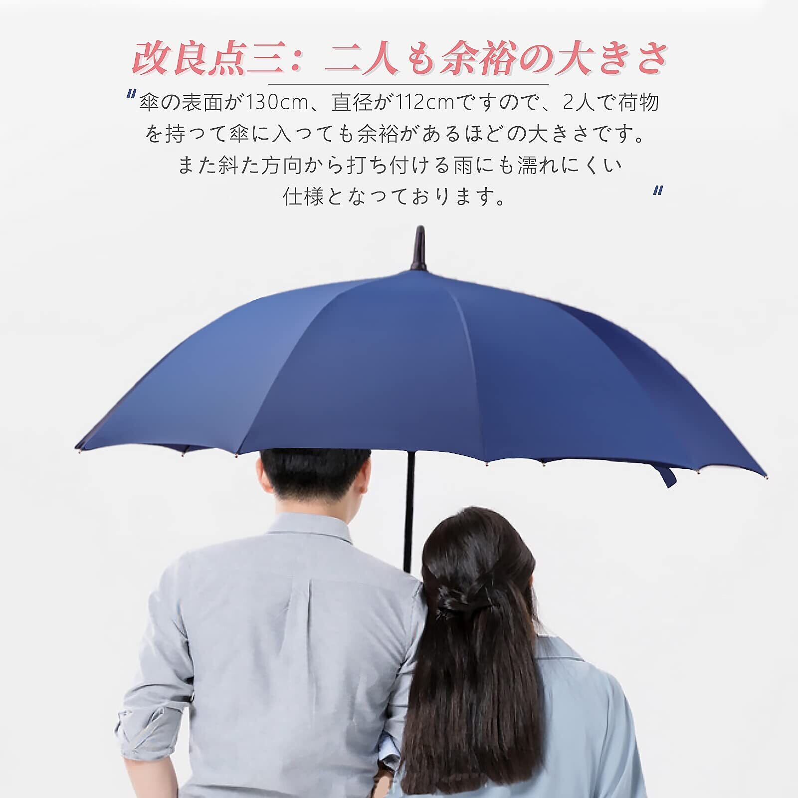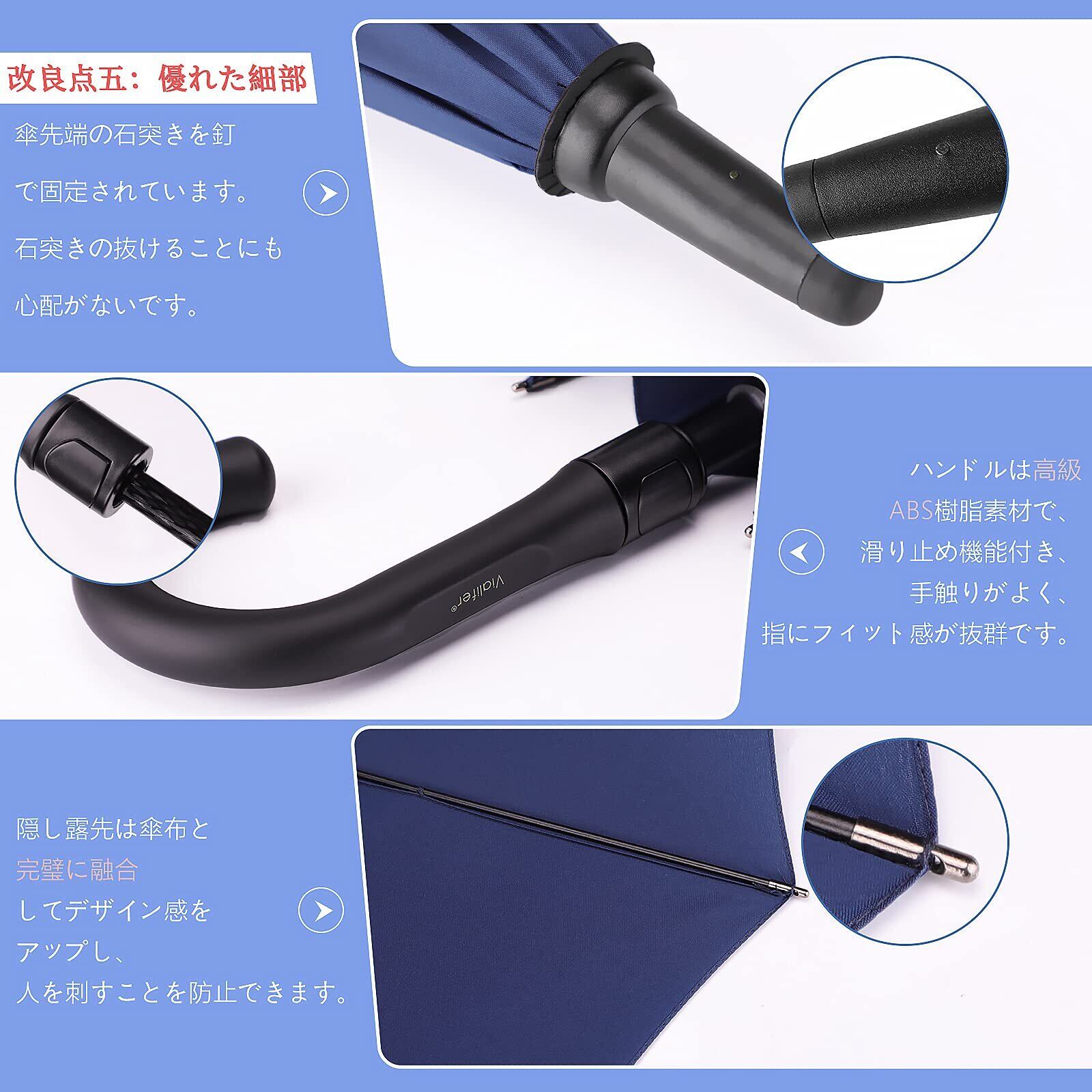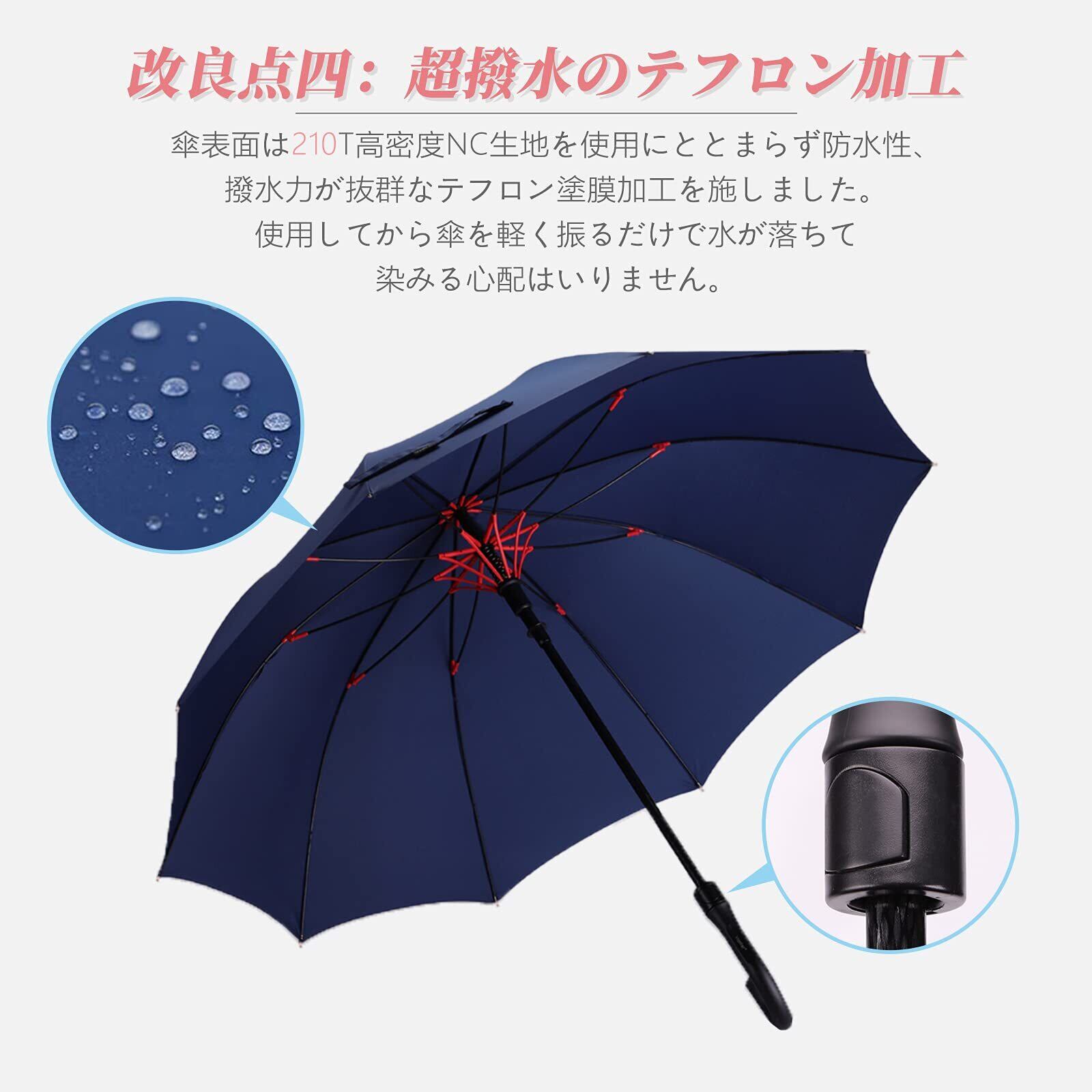 【高強度の材質 】長傘の中棒には高強度のという材質を採用し、頑丈さ、錆びないという二つの特徴を持ちます。それに、中棒を太くして、すこし重さがありますが、耐風性を倍に増加しており、強い風もしなやかに受け流してくれて折れにくくなっています。