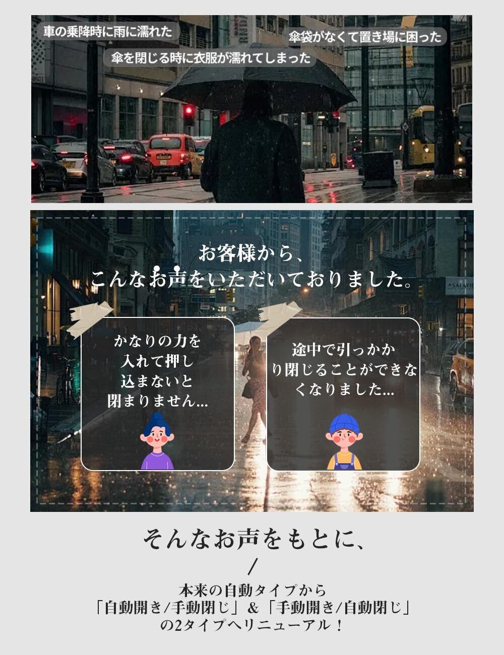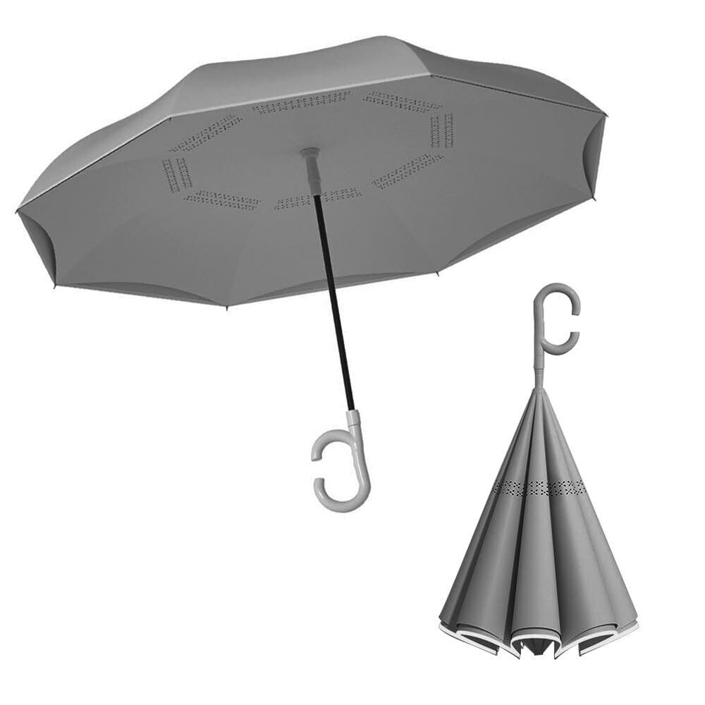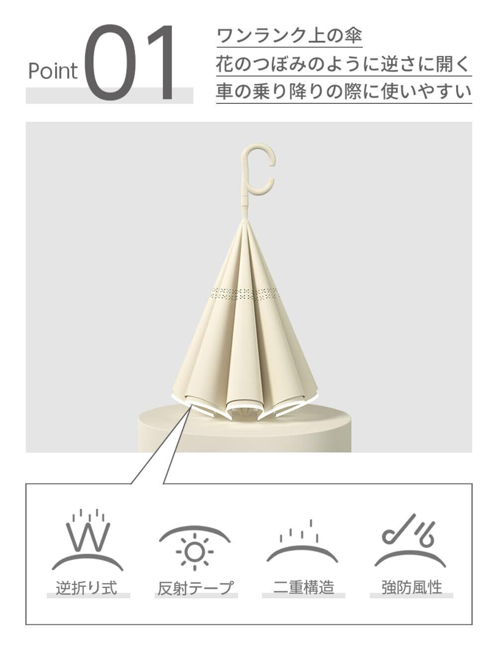 【逆転式革新設計自立傘】 逆折り式設計を採用するので強風と豪雨の際でも軽く降るだけで雨が玉のように一気に落ち、さらに乾きやすい特性も備えています。普通の傘とは異なり、開けたりする際に、雨水が座席や床を濡らす心配がありません、周囲の人にも迷惑をかけることがありません。くるまに乗り降りする際ににも非常に便利です。使用後は直立させて乾かせるので、便利に収納できます。