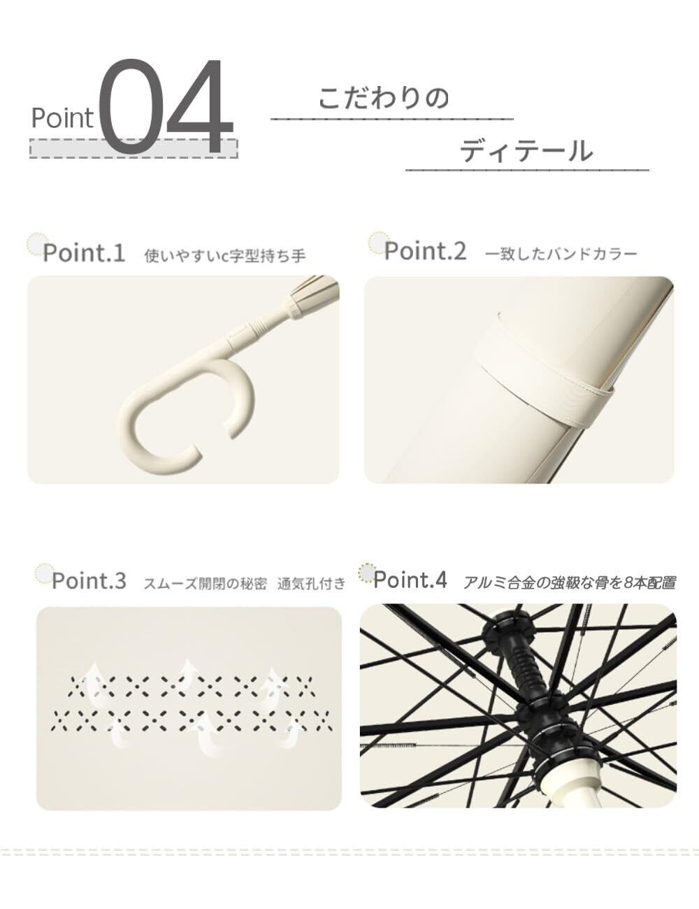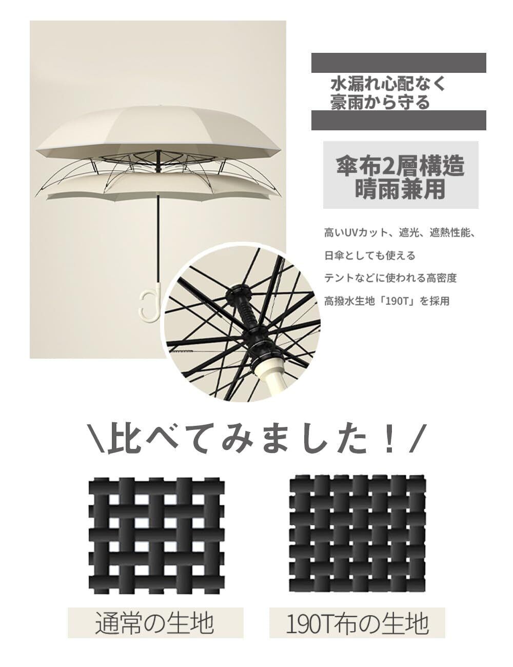 【内外2枚の傘布と通気孔設計 晴雨兼用傘】 210T高密度の二重傘布が紫外線をしっかり防ぎ、傘の裏面の隙間から外層が紫外線と熱を吸収、内層は反射します。ハスの葉のように雨が傘に留まるため、傘が濡れません。さらに、通気孔設計により風通しが良く、風で傘がひっくり返る心配もありません。