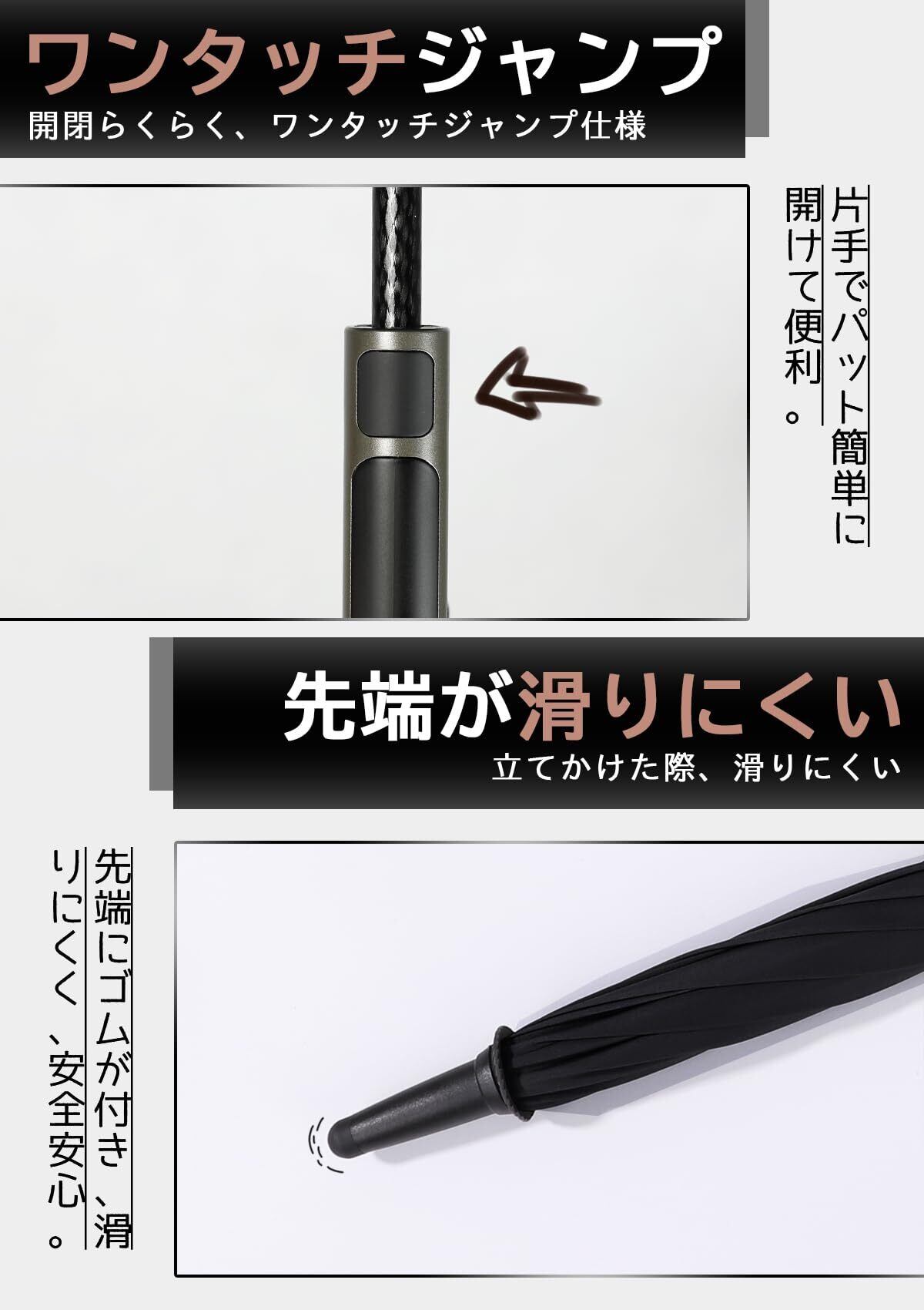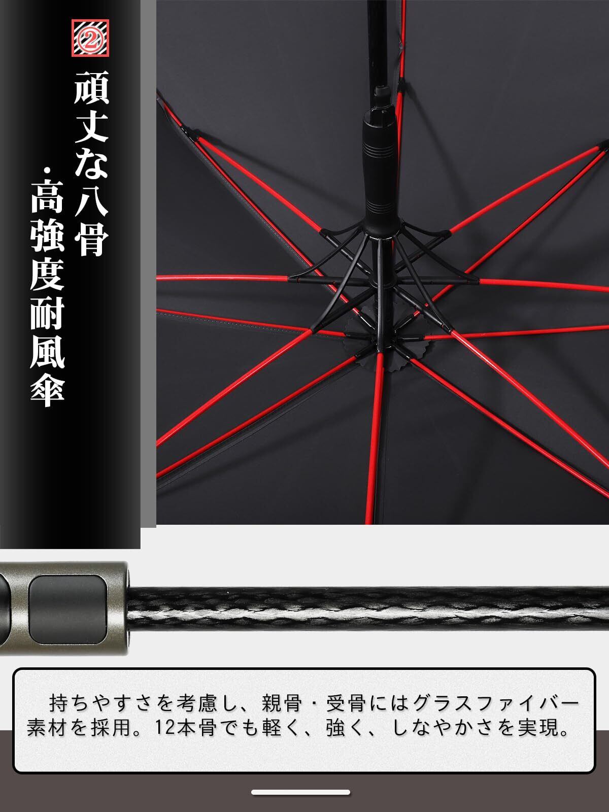 【豪雨&台風対抗の長傘】:わざわざ台風、暴風雨の天気の為に工夫を凝らして設計した耐強風の傘骨となります。強い風にあおられても心強くて安心できる男性専用の紳士傘です。傘骨は柔軟で丈夫なグラスファイバーを採用し、二重構造に出来上がったので今までに無い強度と耐久性を実現しました。かなり耐久性に優れ、暴風雨、台風の天候でも容易に割れたり折れたりする心配がありません。傘の部分が強風で裏返っても元に戻ります。安易に折れたり曲がったりする心配ありません。