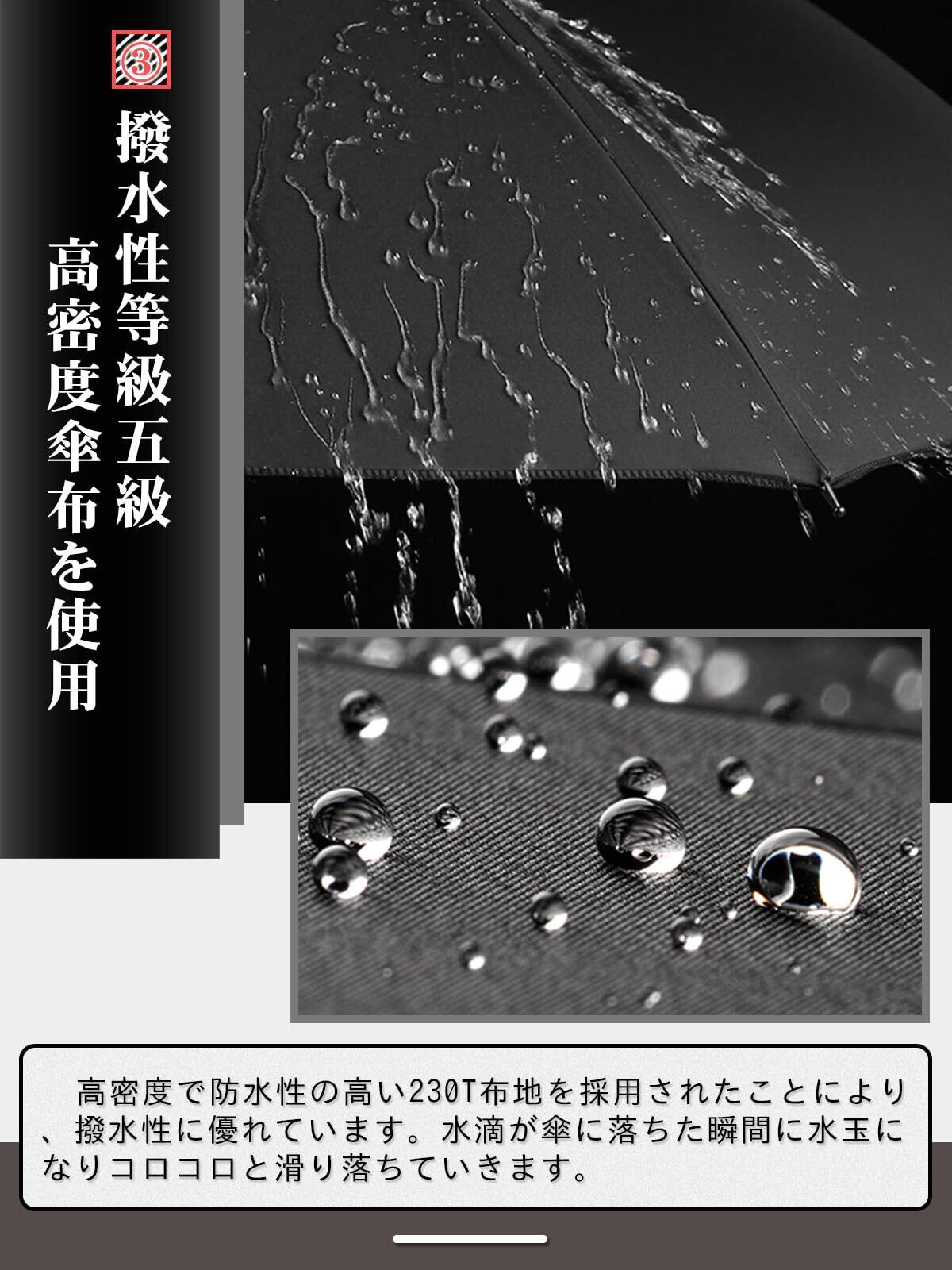 【多層防御・230T高密度NC布】:生地には230Tの高密度NC布でできており、耐水度は通常の傘の2倍以上です。超防水のため、軽く振ると水滴が落ちてくる。もちろん、防汚効果もあります。丈夫な中棒と大面積の傘布は大雨や台風に耐えることができ、傘布のひび割れを心配する必要はありません。また、強い日差しの下では遮光性99%があるため、雨の日だけでなく、暑い季節に通勤用の日よけの傘としても使用できます。