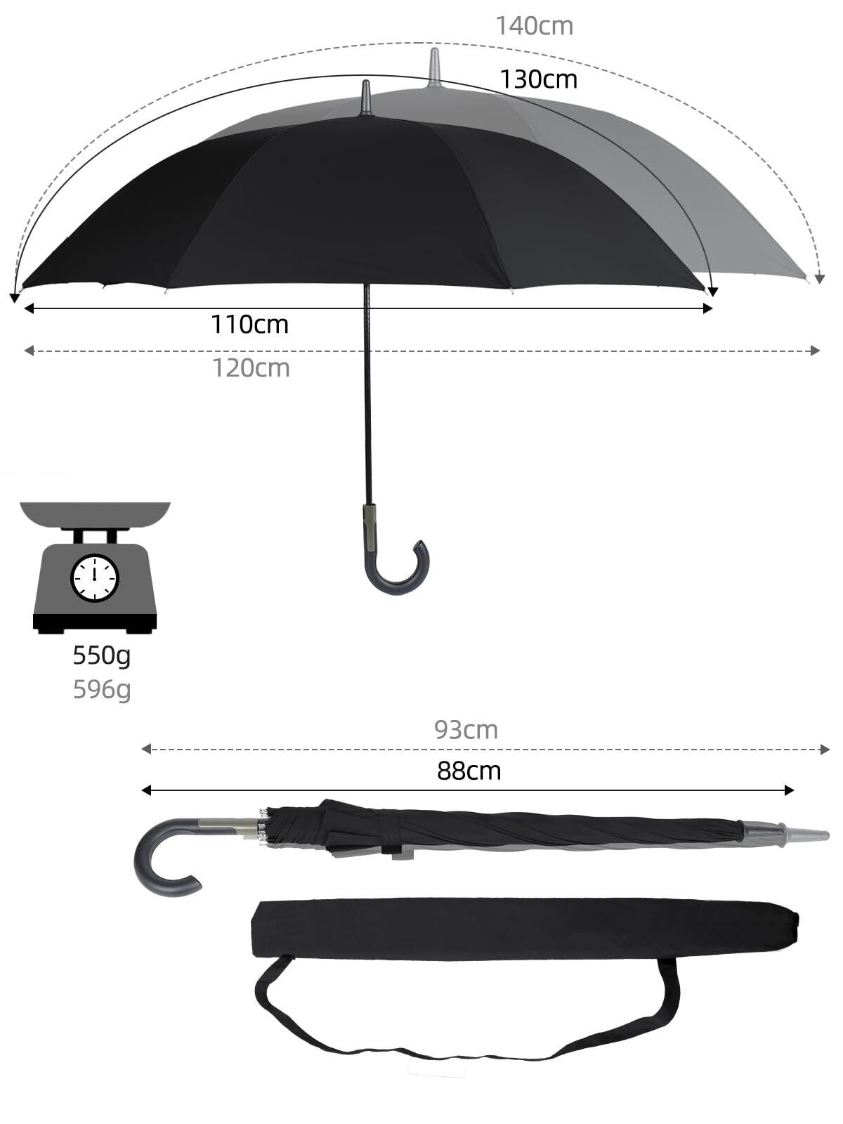 【大判サイズの紳士長傘】:全長:(約)93cm、弧長(約)140cm、直径(約)120cm 三人でも余裕で使える長傘です 。大きいサイズで肩が濡れる 心配もありません。雨を防げる範囲が大きくので、二人で荷物を持って傘に入っても余裕があるほどの大きさです。梅雨はもちろん、豪雨、強風にも安心できます。