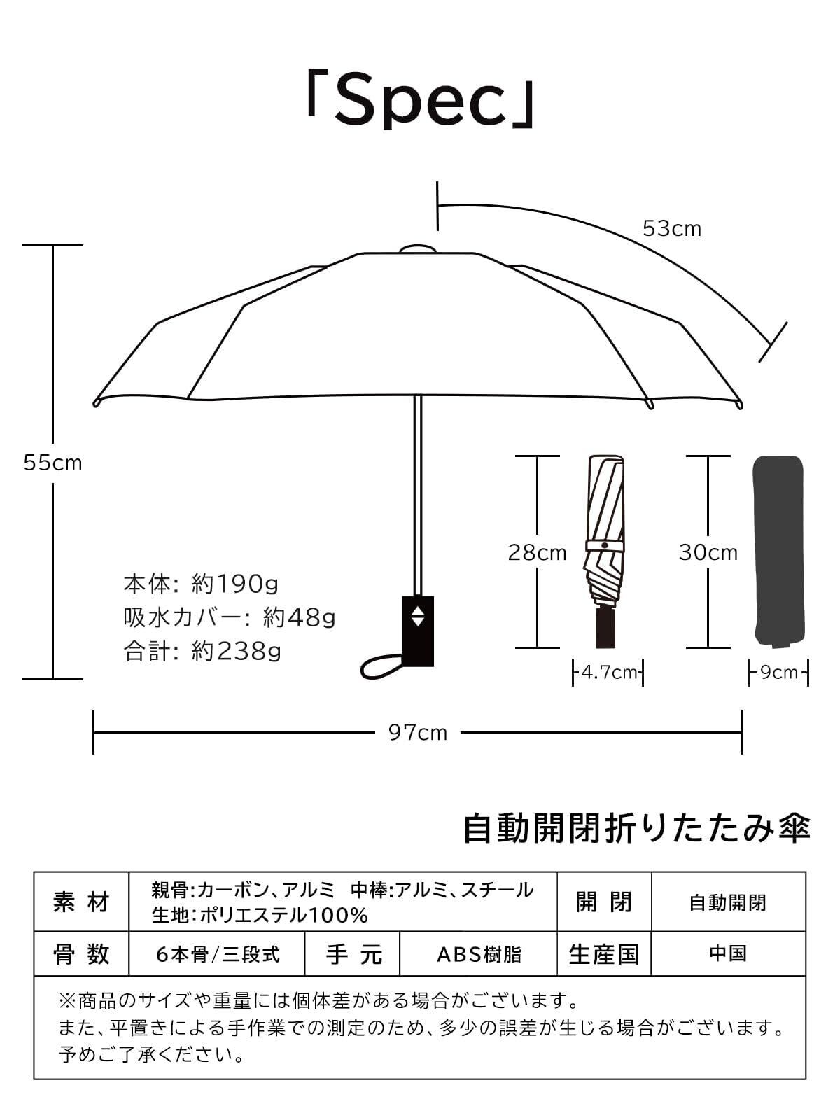 【超軽量カーボン骨・持ち運び便利】自動開閉折りたたみ傘の「重い」との懸念を解消!高級傘にしか使わないカーボンファイバーを使用しております。自動開閉機能付きで、直径97cmの大きさなのに重さはわずか195gです!突然の雨に大活躍してくれます。便利さと軽量さを同時実現できた贅沢な一品!スマホよりも軽量なので毎日持ち歩いても負担かかりません。持っていることを忘れてしますほどの重さです!折りたたむ時の長さは28cm。カバンに入れて携帯できるスリムサイズで急な雨に降られても安心です。