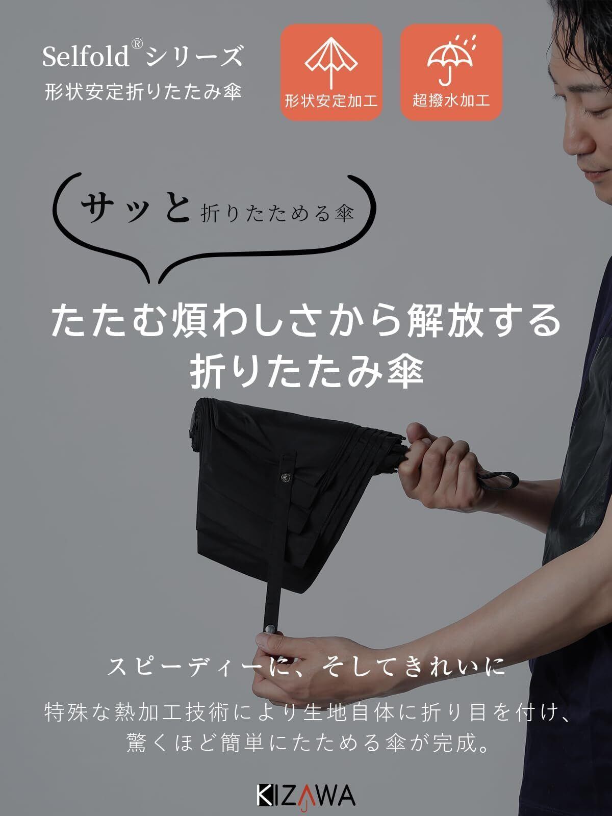 【形状安定加工】折りたたみ傘の畳みにくい難点を解消するために開発した「Selfold」シリーズがついに登場しました!形状安定加工により、通常の折りたたみ傘よりも迅速にたためます。また、収納時にはかさばらず、綺麗にまとめることができます。一般的な形状安定傘は、傘地にシートを貼り付けて作るため、重さが気になったり、使用している中で剥がれてきたり、骨に負担がかかったりする問題点があります。一方でKIZAWAの形状安定傘は特殊な熱加工により「生地そのもの」に折り目をつける加工を施しているため、軽さはそのままで半永久的に効果が持続します。たたむ動作が簡単になるので、これまで苦手意識のあった方も使う煩わしさが軽減されます。