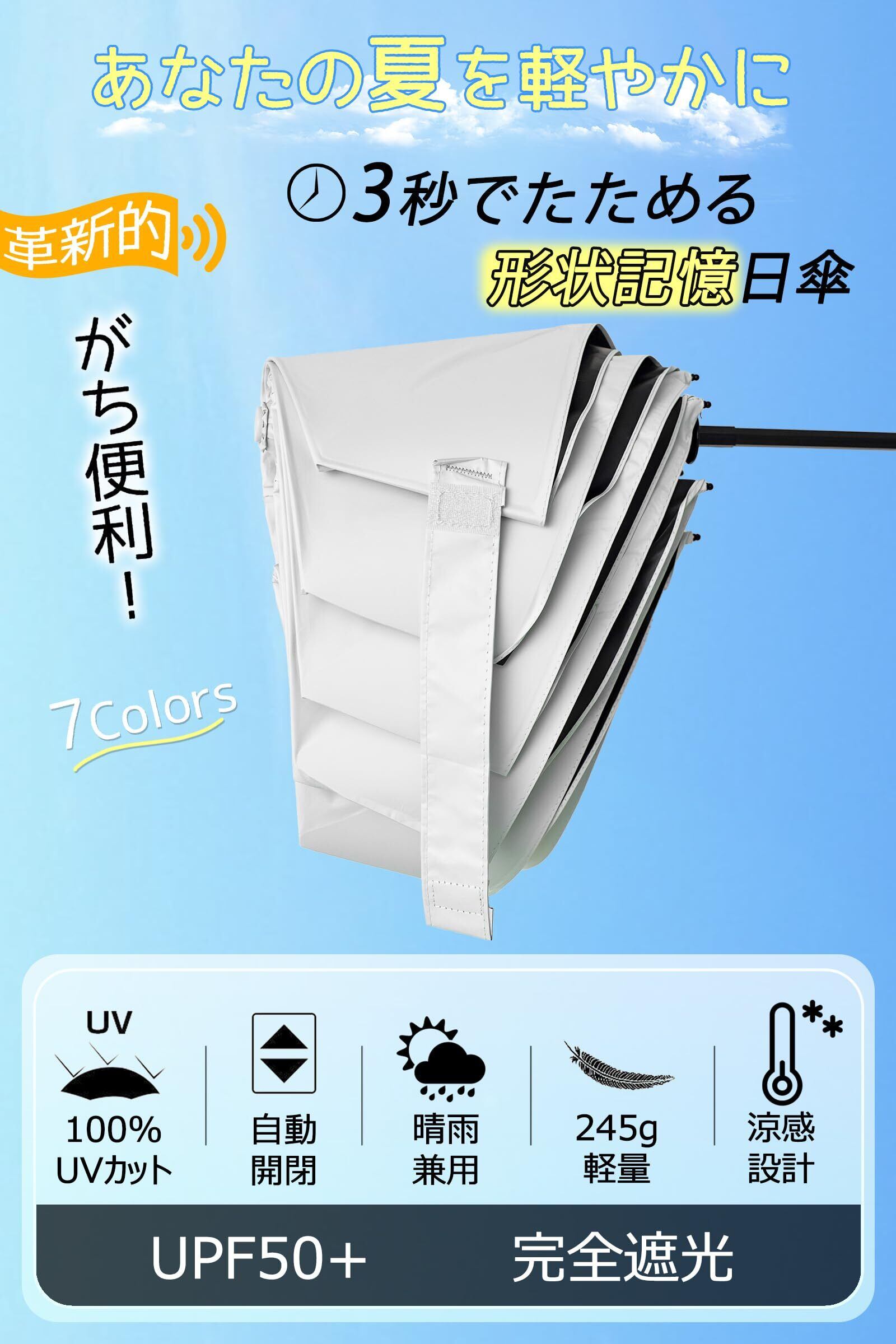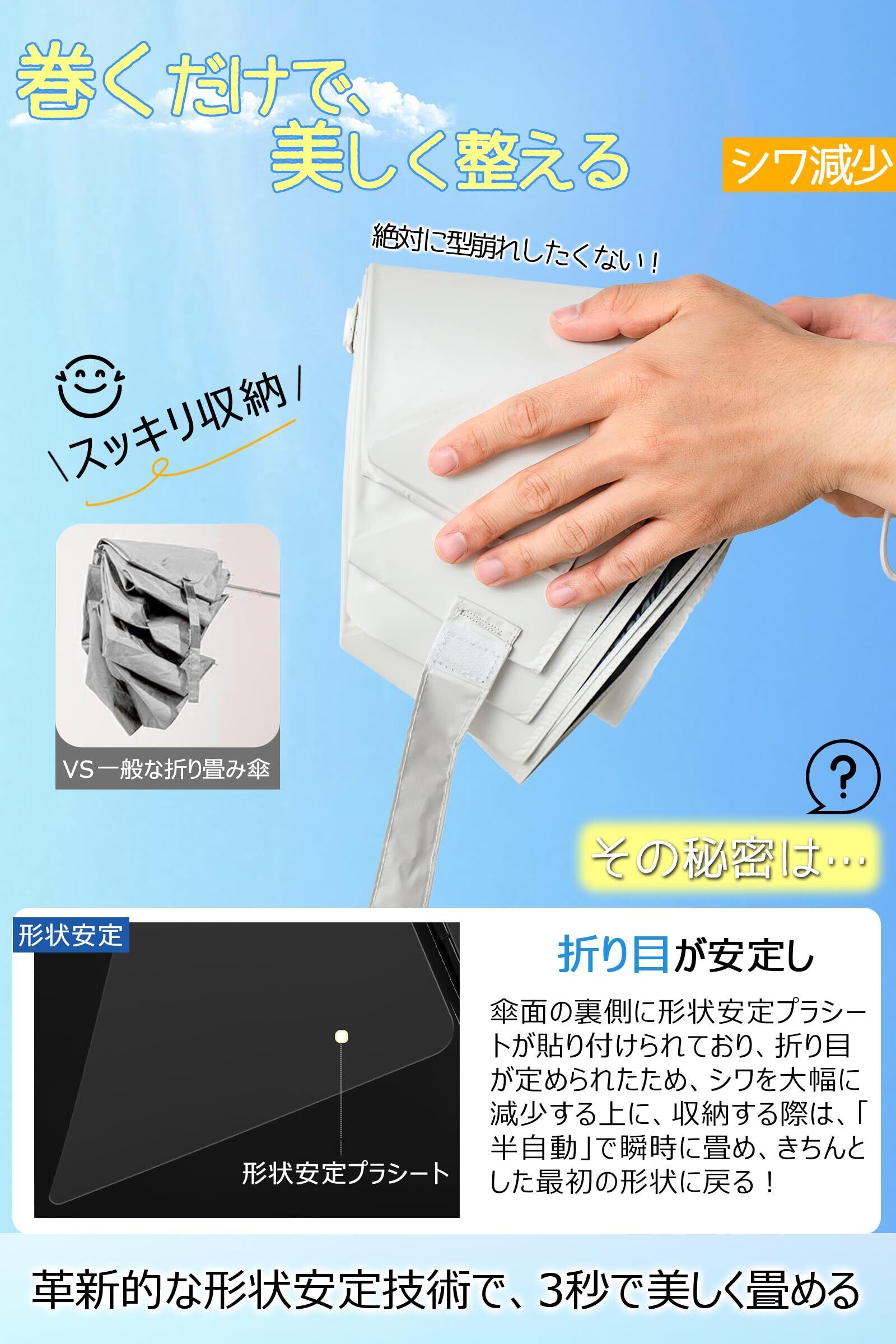 【形状安定&3秒で収納】夏の強い日差しからあなたを守る、スタイリッシュな日傘!革新的な形状安定技術で、わずか3秒で美しく折り畳める。普通の雨傘は折りたたみにくく、さらに日傘の場合、遮光設計により、傘布がシワになりやすいという大きな欠点を持っています。折りたたむとしんどくなります。こちらの形状安定日傘でそんな悩みを解消できます!傘面の裏側にPET樹脂プレートが貼り付けられており、折り目が定められたため、シワを大幅に減少する上に、傘を閉じた後、「半自動」で瞬時に畳め、きちんとした最初の形状に戻る!