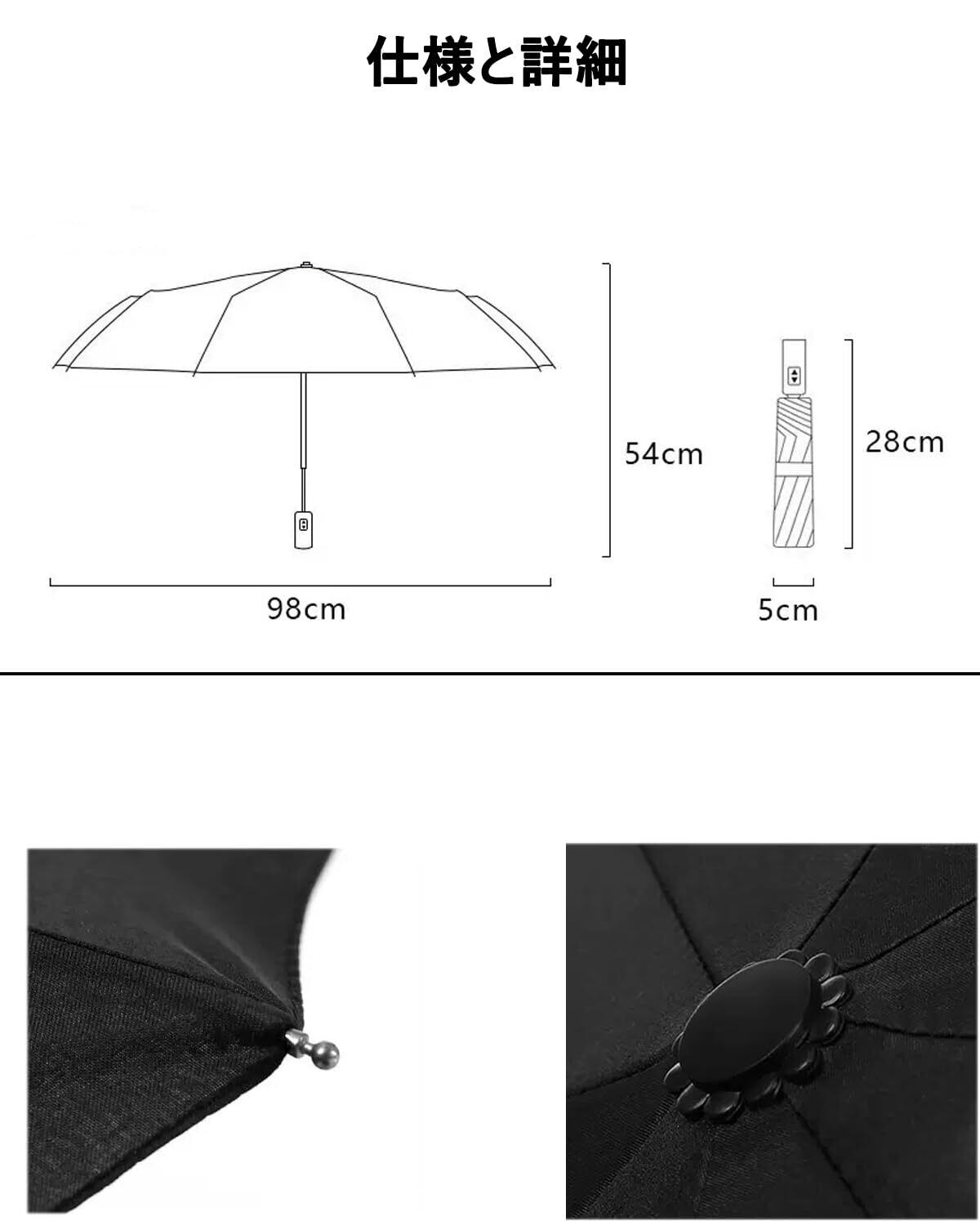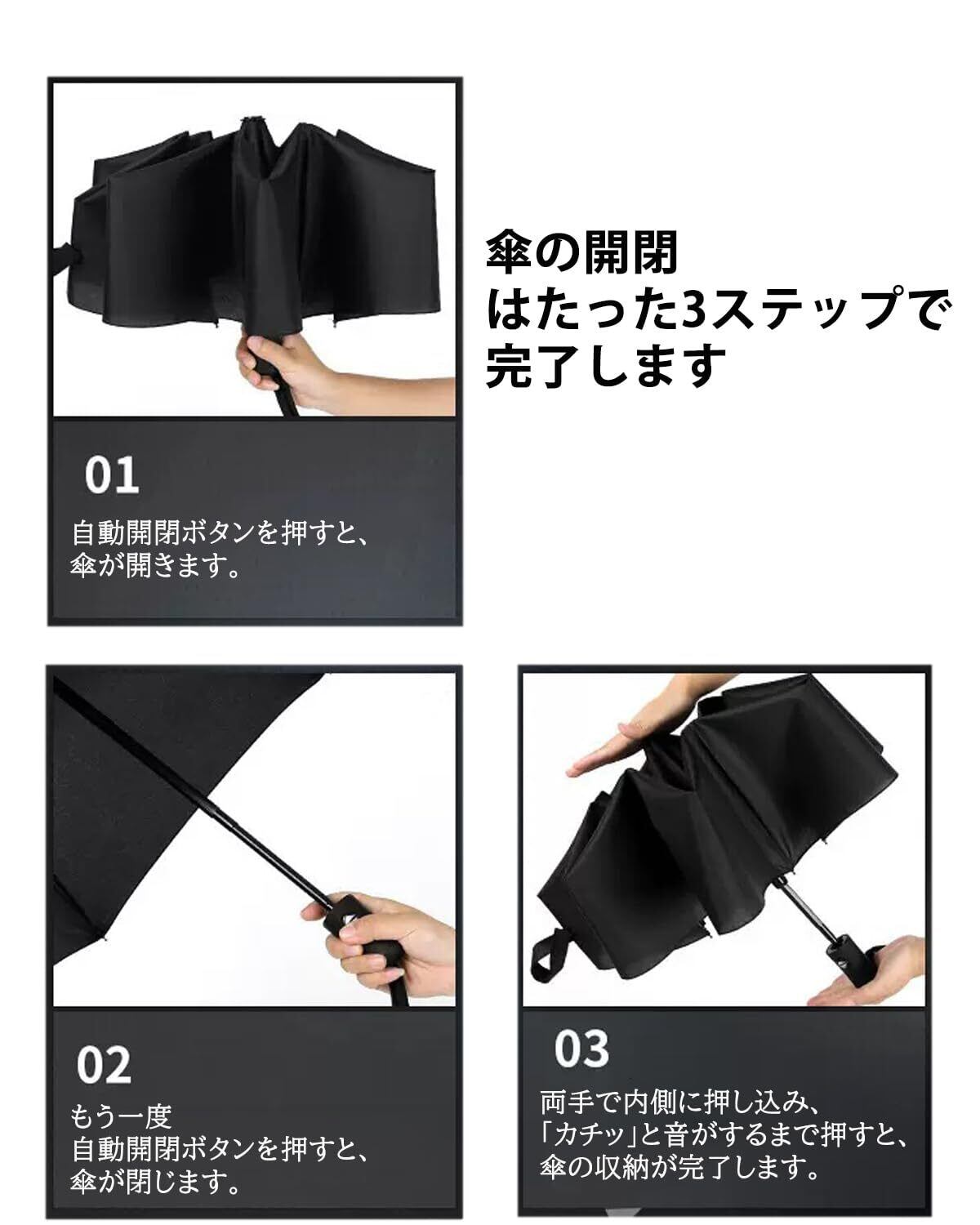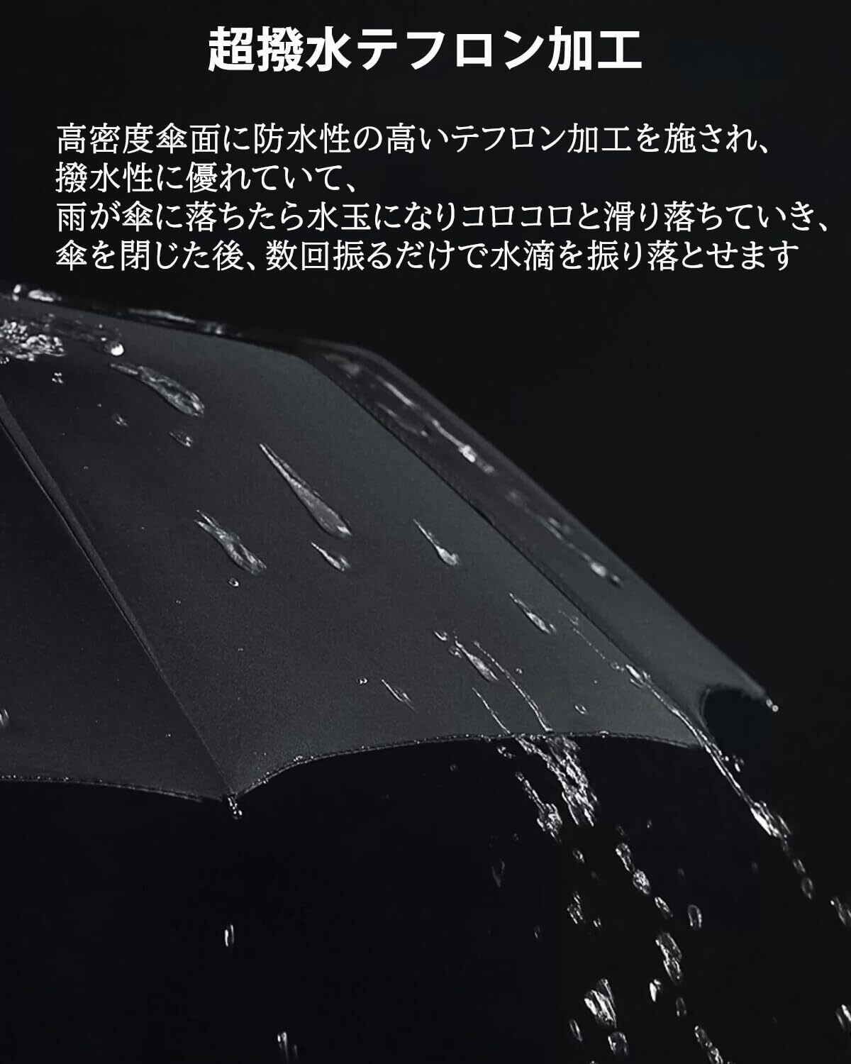 ワンタッチ自動開閉: ワンボタンで一秒開閉可能な自動開閉式を採用。荷物で両手がふさがっている時や車の乗り降り、子供を抱っこしている場面でも片手でスムーズに操作できます。雨の日の煩わしさを解消し、急な豪雨にも素早く対応。バッグや車内に常備しておけば、ビジネスシーンから日常使いまで頼れる便利アイテムです。