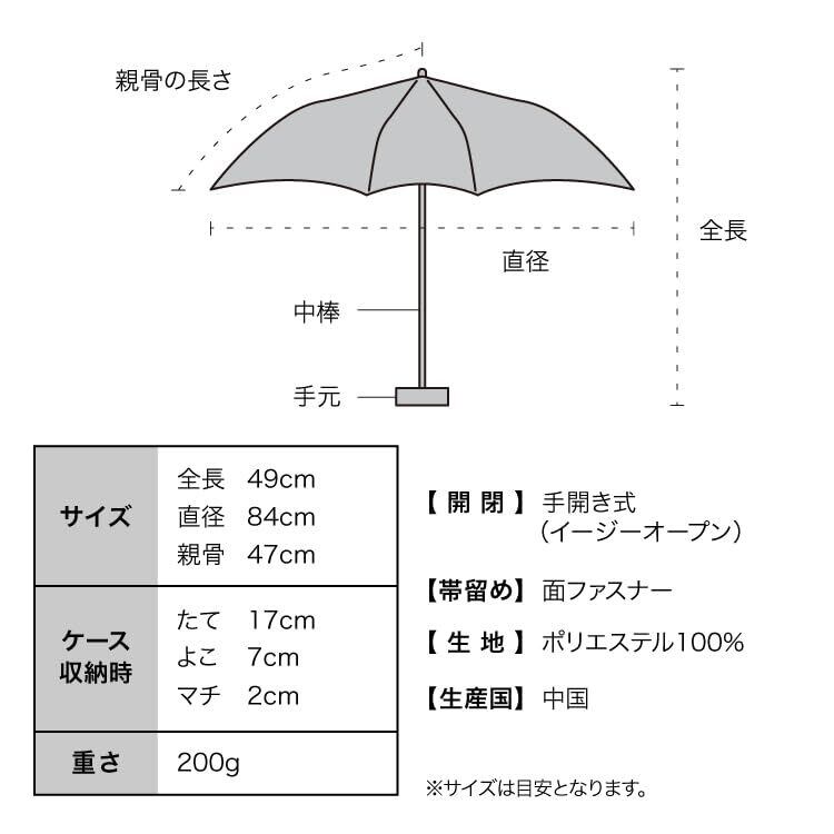 【雨の日も使える日傘(晴雨兼用)】この製品は日傘としてお使いいただくことを主としていますが、はっ水防水加工を施しているため雨傘としてもお使いいただけます。※激しい雨や長時間の雨傘としてのご使用は雨漏りや色落ちの原因となる可能性がございます。またデザインの特性上、完全な防水はっ水加工が難しい場合があり、雨が染み込むことがありますのでご注意ください。