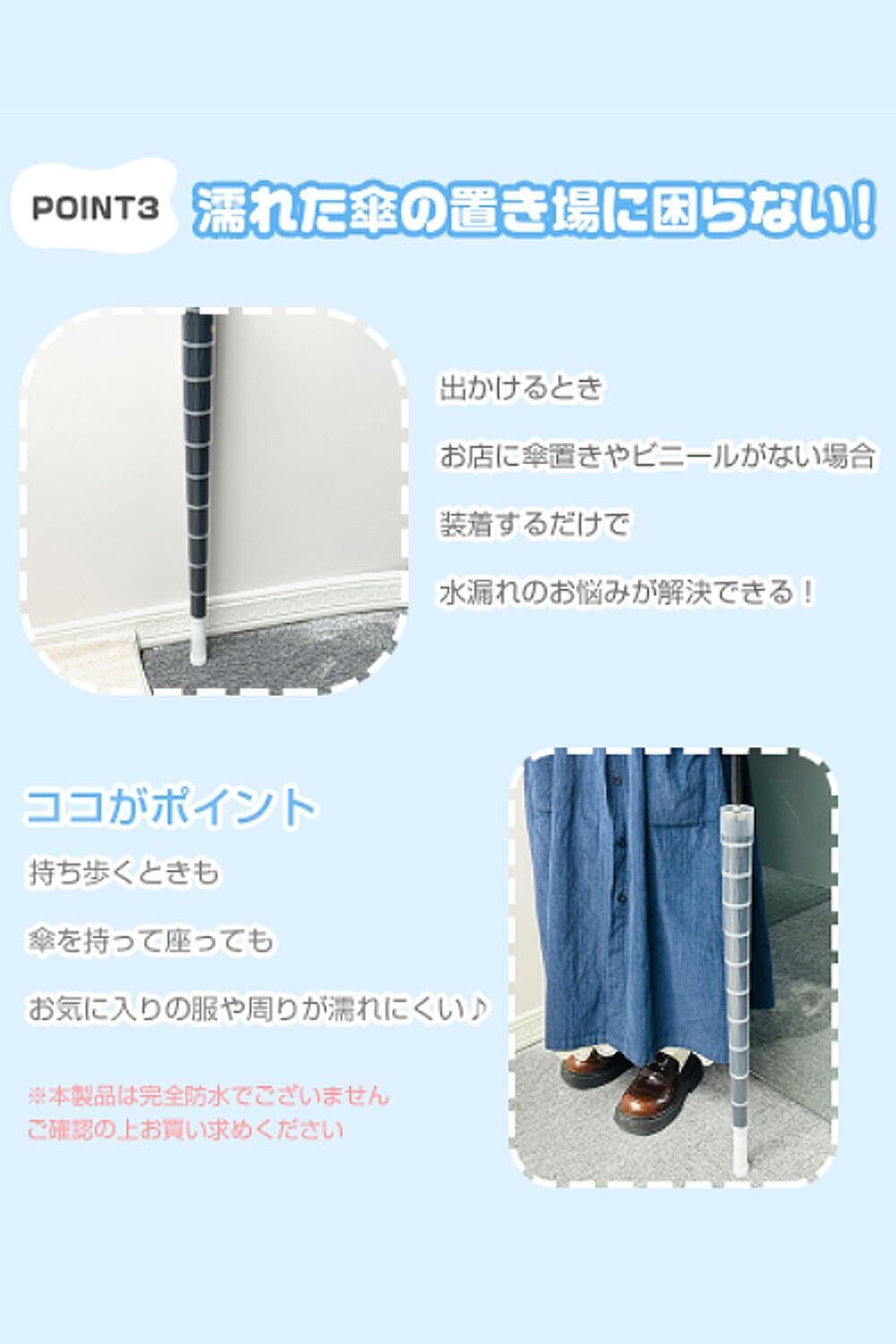 ●POINT3.濡れた傘の置き場に困らない! 出かけるとき、お店に傘置きやビニールがない場合、装着するだけで、水漏れのお悩みが解決できる! 持ち歩くときも、傘を持って座っても、お気に入りの服や周りが濡れにくい ※本製品は完全防水でございません。ご確認の上お買い求めください。