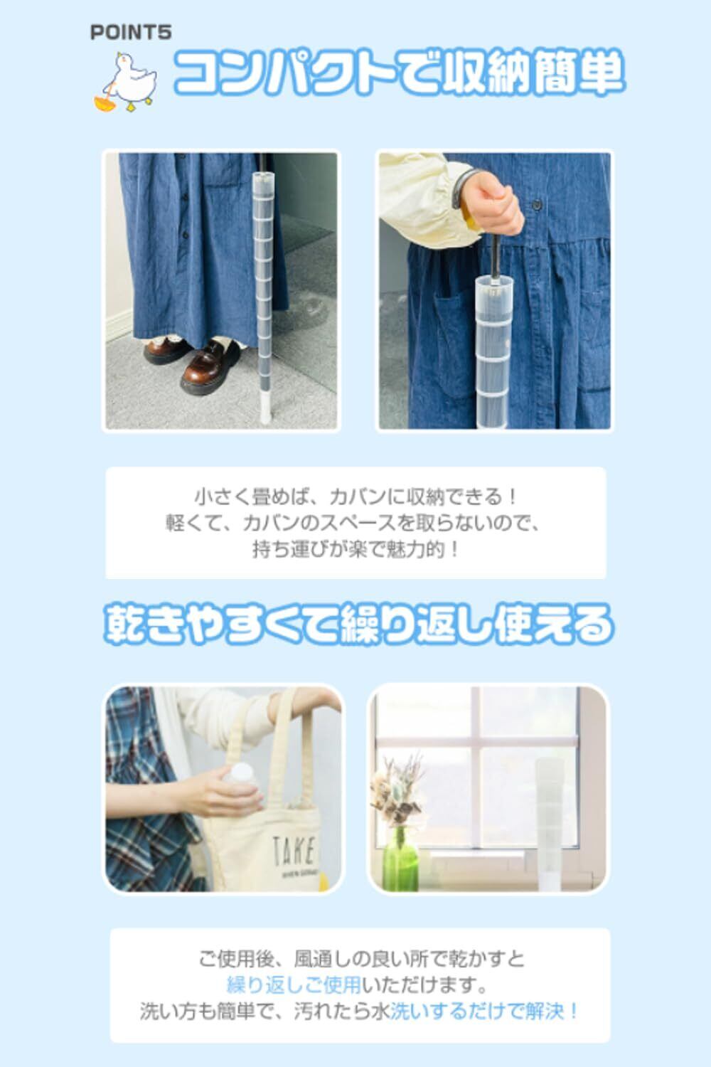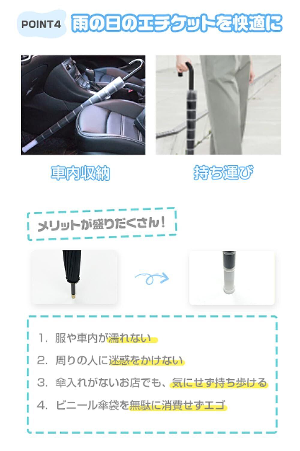 ●POINT4.雨の日のエチケットを快適に 車内収納、持ち運びもとても楽 メリットが盛りだくさん! 1.服や車内が濡れない 2.周りの人に迷惑をかけない 3.傘入れがないお店でも、気にせず持ち歩ける 4.ビニール傘袋を無駄に消費せずエゴ