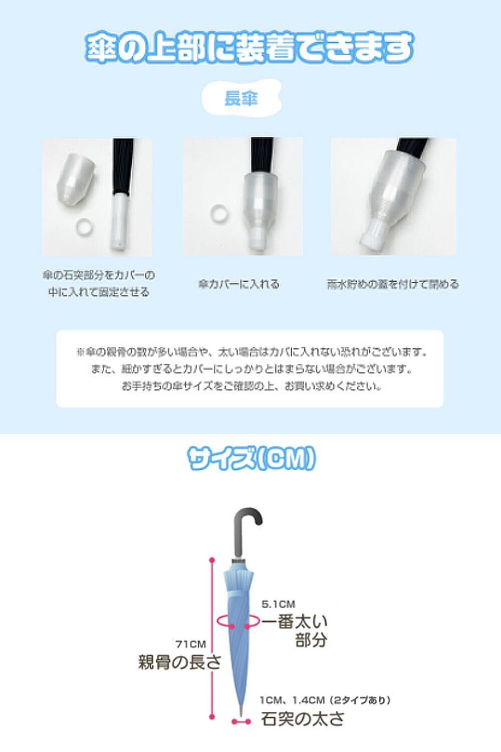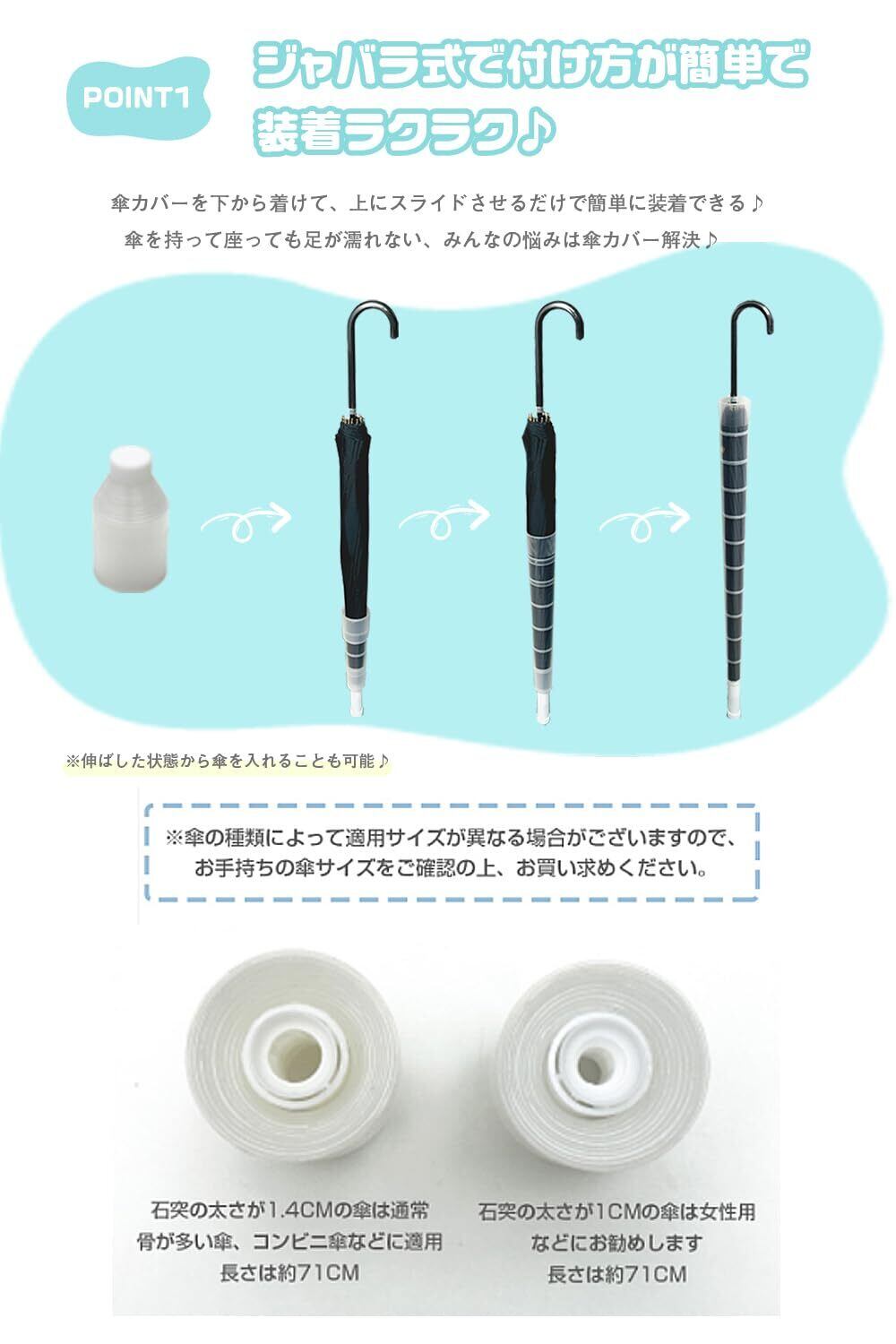 ●POINT1.ジャバラ式で付け方が簡単で、装着ラクラク 傘カバーを下から着けて、上にスライドさせるだけで簡単に装着できる 傘を持って座っても足が濡れない、みんなの悩みは傘カバー解決 ※伸ばした状態から傘を入れることも可能