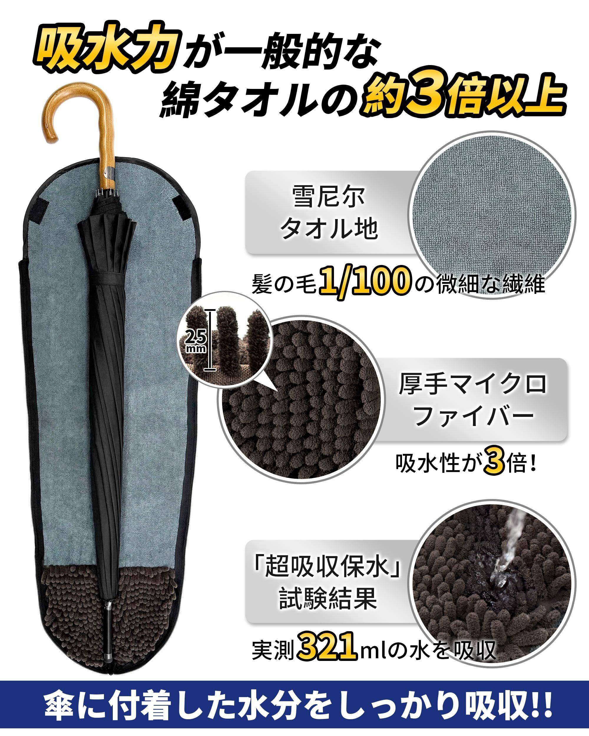 【強化ファスナー&二重防水構造】 スムーズな強化ファスナーで開閉自由自在、水漏れゼロ。外側の防水生地と内側の吸水層が染み出しを防ぎます。雨の日でもカバン内部や車内を濡らさず、傘をすっぽり収納できます。先端のマイクロファイバーが水滴をキャッチします。一般的なタオルの3倍の吸水性で、傘の水滴もサッと拭き取れます。