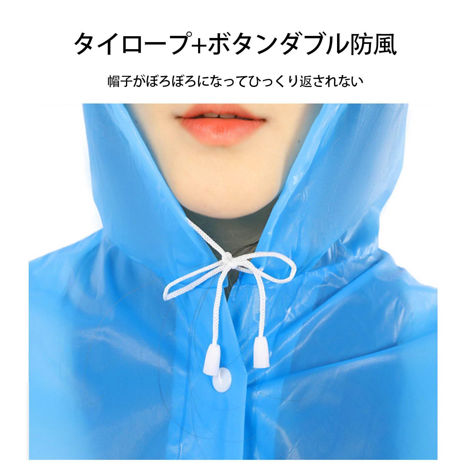 【ひも付きフード】レインコートのフードには紐が付いており、雨の日でもしっかりと頭部を保護します。突風や雨粒の飛び散りから守ることができます。フードをかぶることで、雨風の影響を最小限に抑え、顔をしっかりガードして快適な外出が可能です。