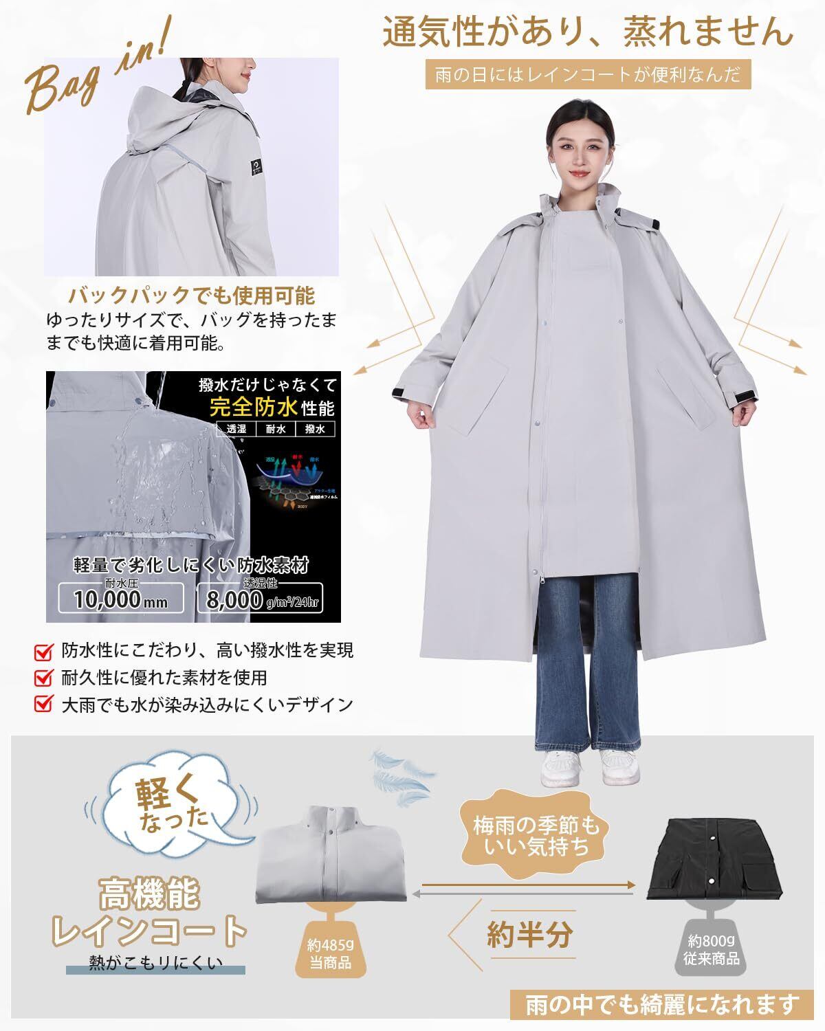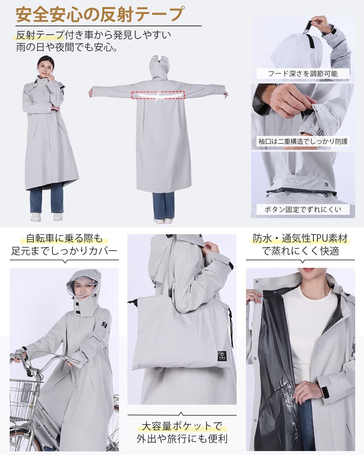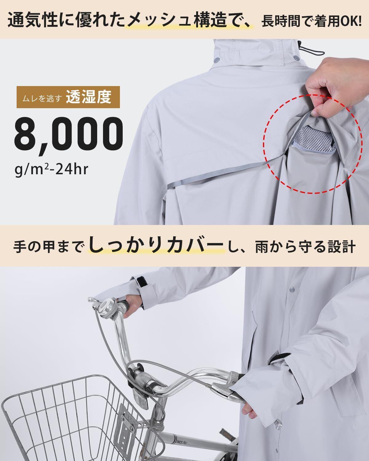 HINOKAZEの新作、晴れの日も雨の日も、あなたのスタイルを格上げする一着:1.高品質ポンジーを採用し、通気性に優れてムレにくく快適な着心地を実現。メッシュライナー付きで汗をかいてもベタつかず爽やか。TPUコーティングで防風・防水性もアップし、雨の日も快適なライディングをサポート。2.手の甲をしっかり守るカバー付きで濡れを防ぎ、自転車走行中も安心。3.着脱可能なフードと透明バイザーで顔をしっかりガードし、リュック対応デザインでアウトドアや通勤・通学にも最適なスタイリッシュレインコートです。