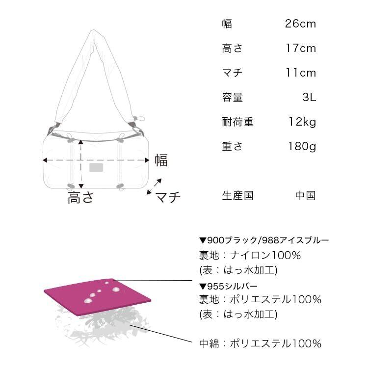️はっ水加工を施した生地を使用 ️クッション性とボリュームのある中綿入り ️内側には2ポケット付き ️ショルダーはドローコードで調節可能 ️耐荷重12kg ️容量 3L ️重さ:180g