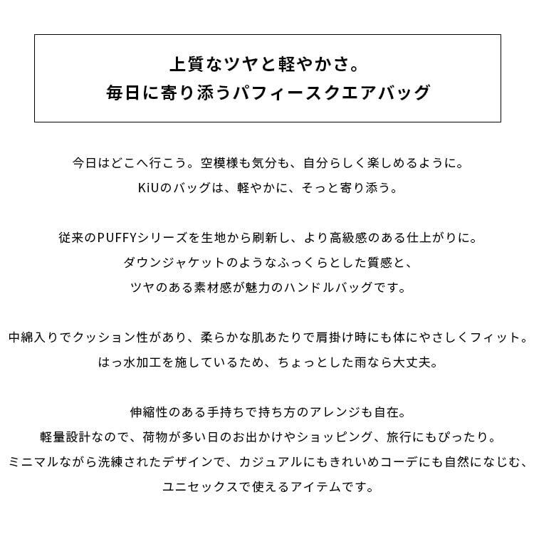 【上質なツヤと軽やかさ。毎日に寄り添うパフィースクエアバッグ】 今日はどこへ行こう。空模様も気分も、自分らしく楽しめるように。KiUのバッグは、軽やかに、そっと寄り添う。 従来のPUFFYシリーズを生地から刷新し、より高級感のある仕上がりに。ダウンジャケットのようなふっくらとした質感と、ツヤのある素材感が魅力のハンドルバッグです。 中綿入りでクッション性があり、柔らかな肌あたりで肩掛け時にも体にやさしくフィット。はっ水加工を施しているため、ちょっとした雨なら大丈夫。 伸縮性のある手持ちで持ち方のアレンジも自在。軽量設計なので、荷物が多い日のお出かけやショッピング、旅行にもぴったり。 ミニマルながら洗練されたデザインで、カジュアルにもきれいめコーデにも自然になじむ、ユニセックスで使えるアイテムです。