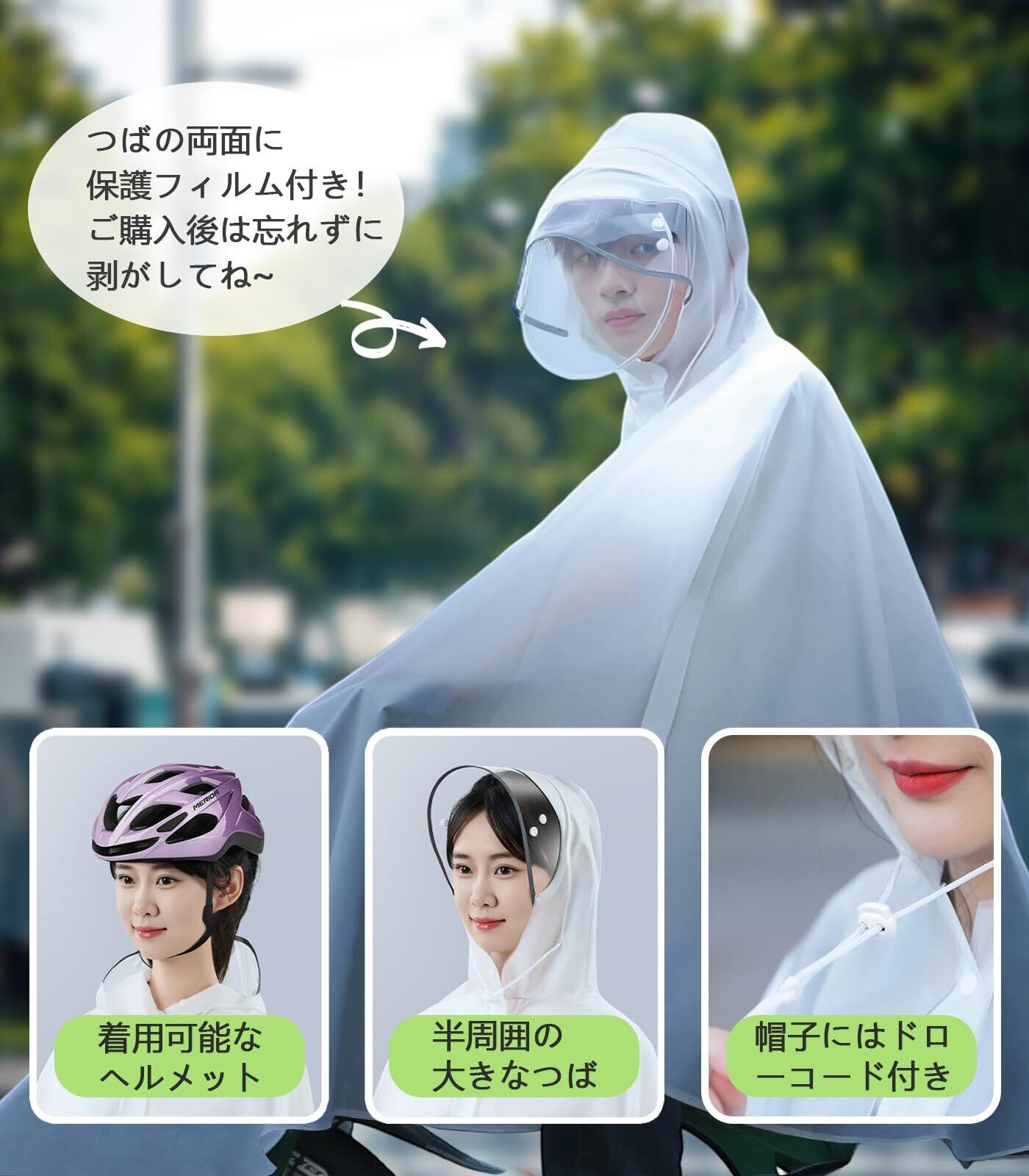 【クリアな視界、快適な防護】アップグレードされた高透明度のダブルバイザーは、雨風をしっかり防ぎながら、視界を妨げません。半円形の大型バイザーが包み込むような着用感を提供し、快適性を向上させます。フェイスマスクは取り外し可能で、天候に応じて柔軟に対応。ヘルメット着用時にも簡単に取り外せるため、安心して自転車に乗れます。レディースからメンズまで幅広く対応し、軽量で着心地抜群のポンチョタイプのカッパです。