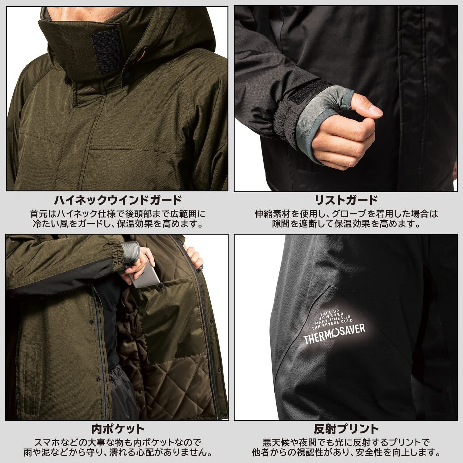 ●ロングセラー商品がさらにアップグレード! ●顔のほとんどを覆いつくすハイネック仕様で、冷たい風をガードし保温効果を高めます。●腕の上下運動を容易にするアクションカットを採用で、作業時のストレスを軽減します。●収納力の高い内側ポケットを採用。●右袖に再帰性反射プリントを使用したデザインプリントを採用しており、夜間時でも安心して着用できます。●袖口からの冷気の浸入を堰き止めるリストガードを採用。