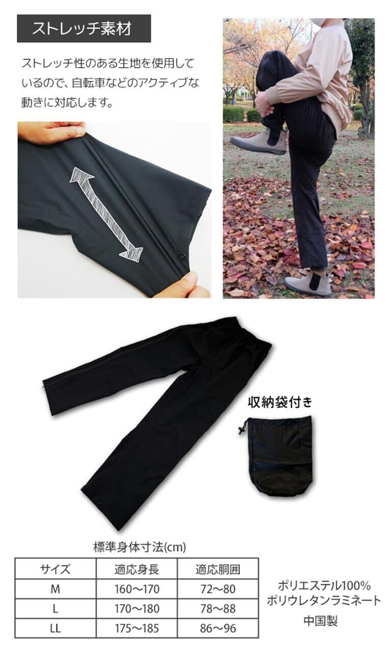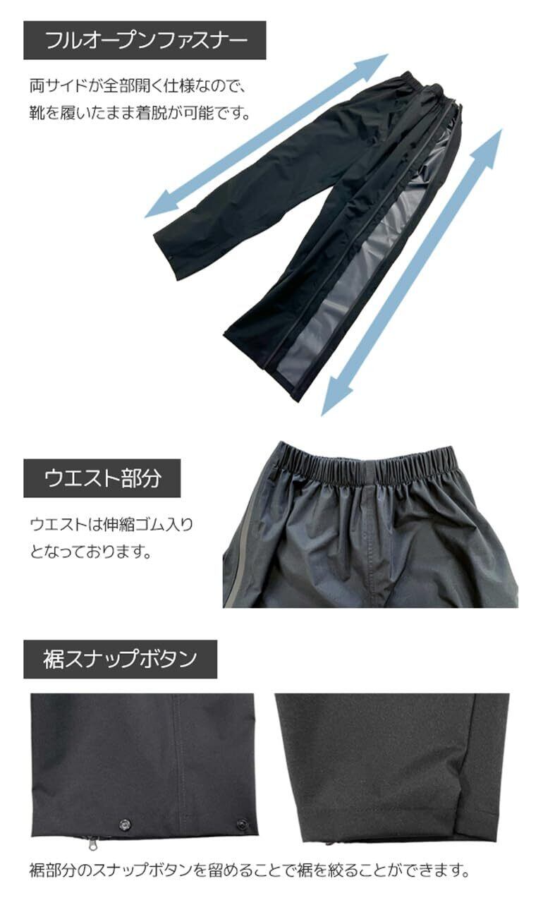 【リニューアル】 たくさんのお声をいただいておりました 「ウエスト部分がきつい」を改善致しました。 ウエスト部分が改善され、平置きで30cmから大幅に大きく調整しました。 ゴムの伸縮性も調整され、よりゆったりとした着心地を実現しました。 男女兼用で、サイズはMからLLまでご用意しており、多くの方にフィットする設計です。 靴を履いたままでも簡単に着脱可能な「ストレッチジップパンツEX」は、 MAKUAKE(クラウンドファンディングサイト)で目標金額808%を達成した話題のレインパンツです。 耐水圧10,000mmと高い防水性を誇り、内部の湿気を逃がす透湿性も5000g/m²/24hと優れています。 レインパンツを穿いた状態から、両サイドのファスナーを開くと靴をはいたままレインパンツを脱ぐことができます。 これにより、雨の日の登山やキャンプ、釣りなどのアウトドア活動はもちろん、 通勤や通学にも快適にご使用いただけます。 特に注目すべきは、両サイドが完全に開くフルオープンデザイン。 この機能により、靴を脱がずにパンツを素早く着脱することが可能です。 また、止水仕様のファスナーと内側フラップが雨水の侵入をしっかりと防ぎます。 ストレッチ素材を使用しているため、動きやすさも抜群で、 黒色のシンプルなデザインはどんなアウトドアギアとも相性が良く、 登山、キャンプ、釣りなどのアクティブなシーンでもストレスフリーで動けます。 シンプルながら機能的なデザインのこのレインパンツは、 どんな天候にも対応するための必需品です。男女兼用で、 様々なサイズが用意されており、どなたでも快適にお使いいただけます。 雨の日のアウトドアや日常生活をより快適に、 そしてスタイリッシュに過ごすために、このパンツをぜひお試しください。 ※こちらの商品は前開きファスナーは付いておりません。