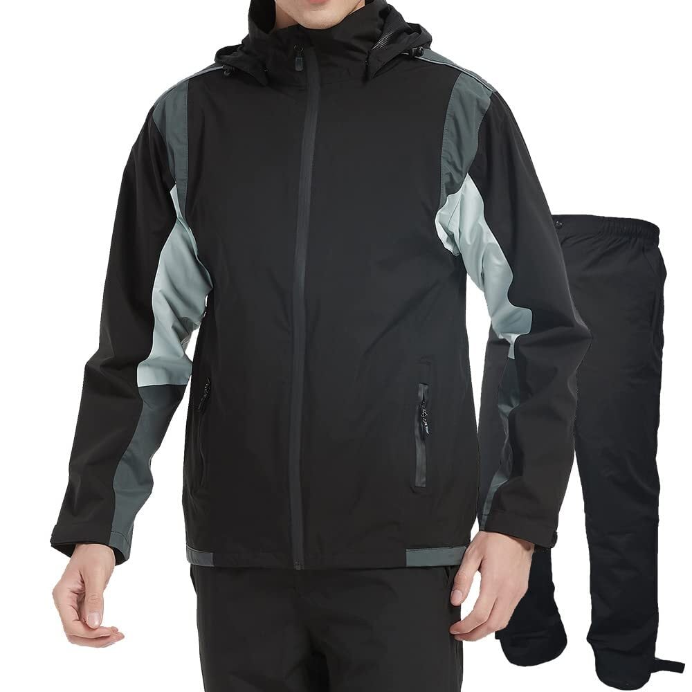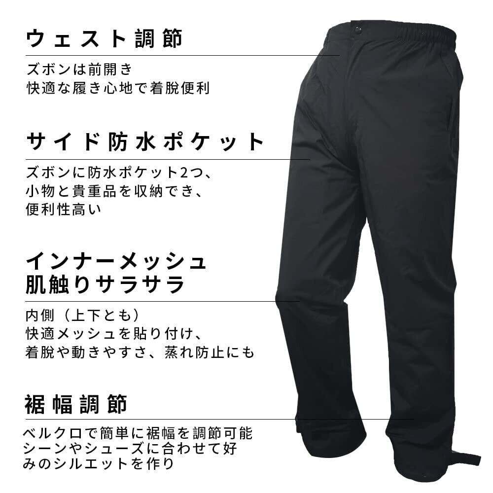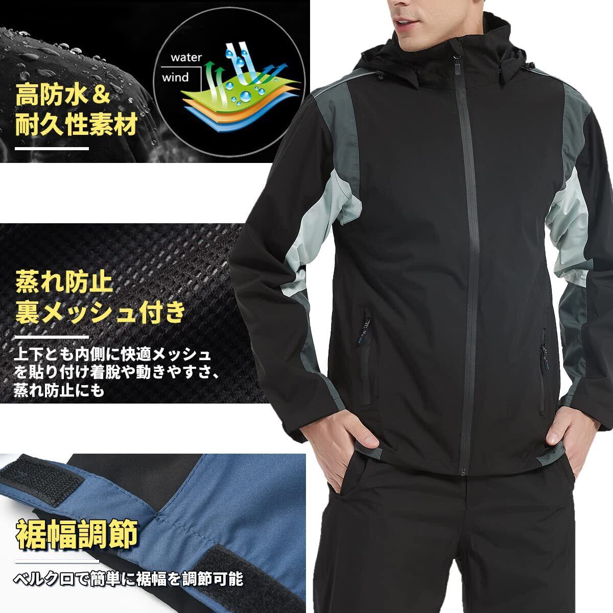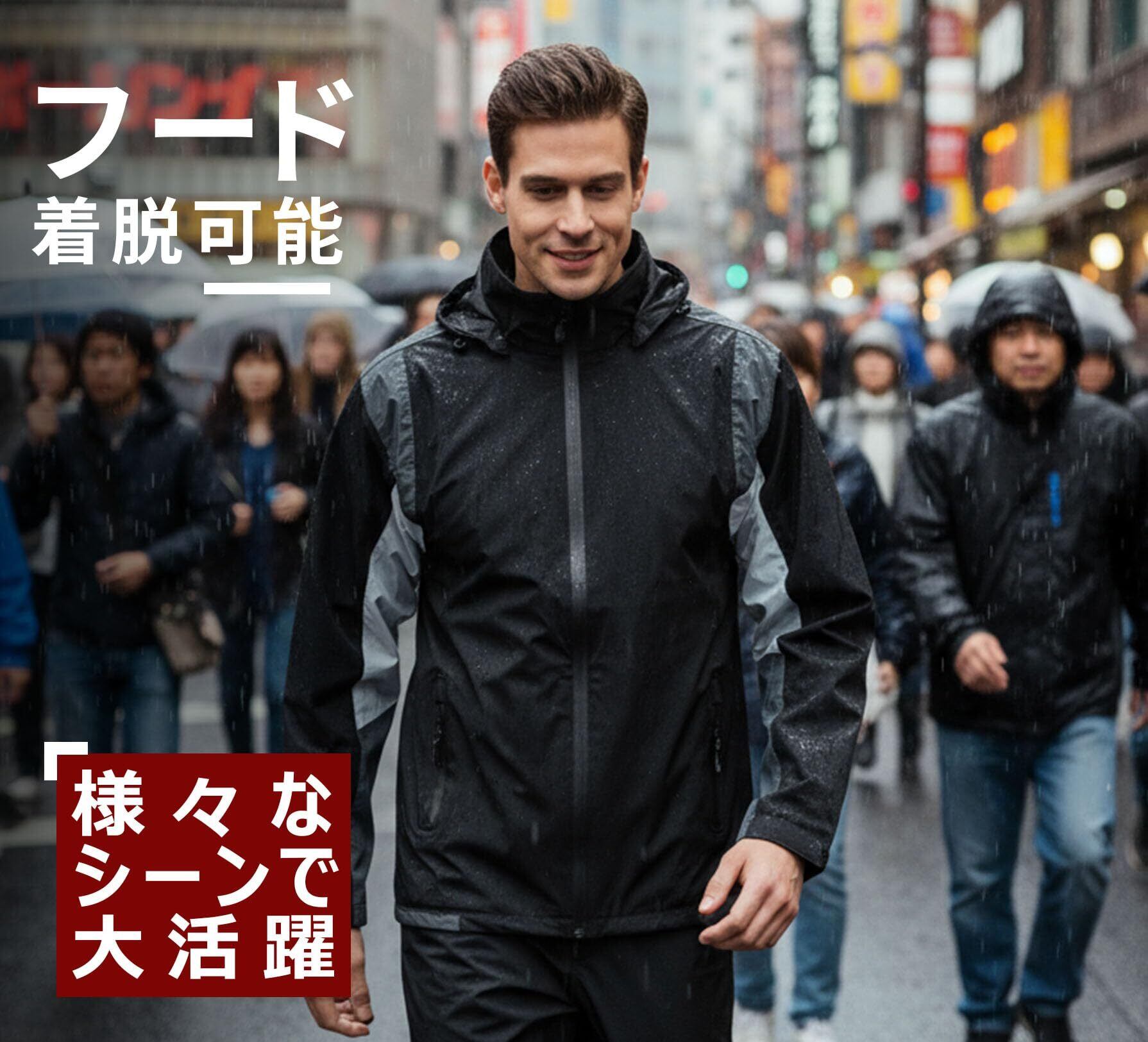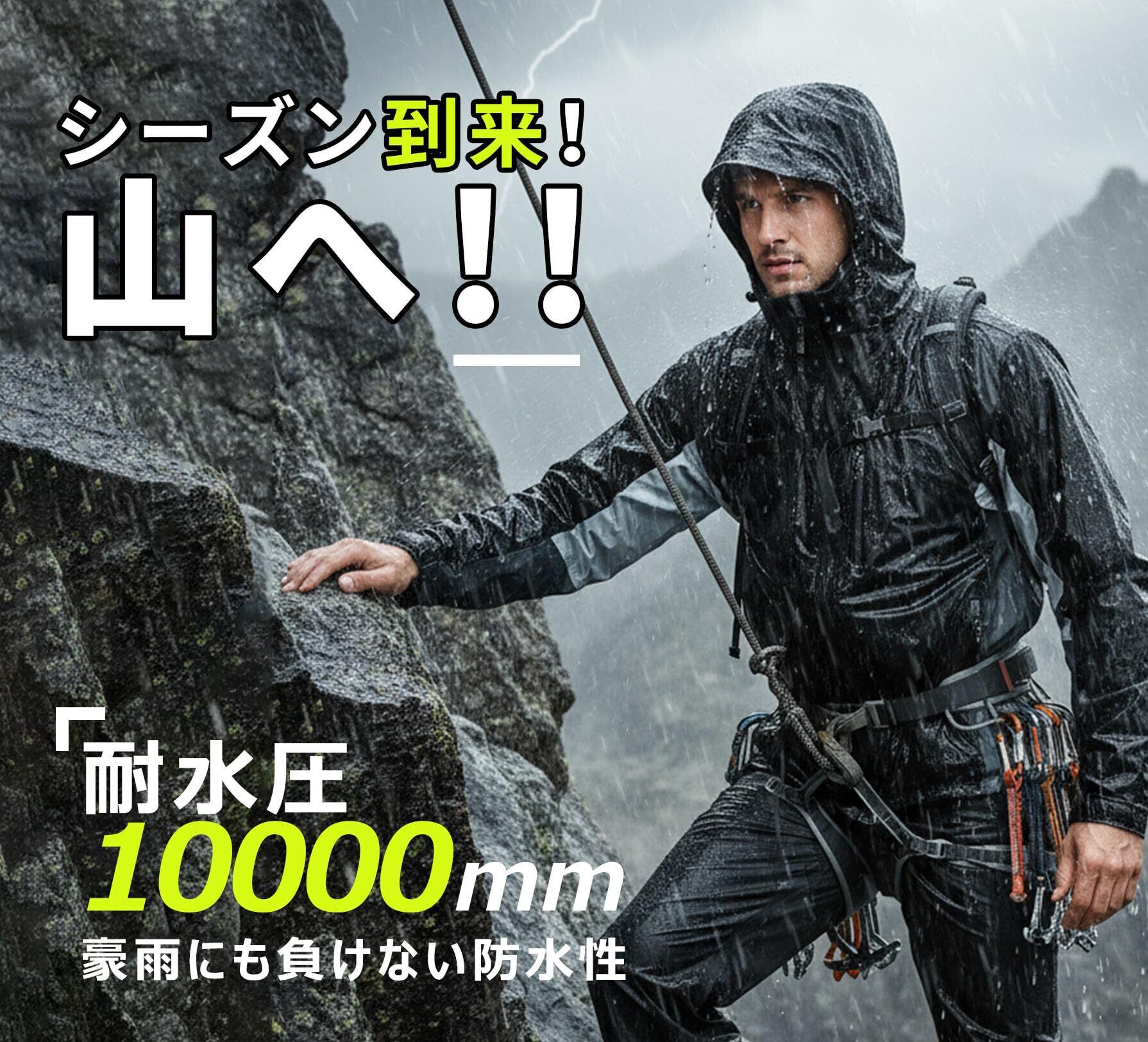 【超防水・仕様】両面防水を備えたレインスーツ、縫い目に特殊な加工を施し、防水性を高め、豪雨であっても水の浸入を強力に防ぐ。フードは着脱でき、首元のドローコードでフィット感調整可能、ズボンは前開きです。マジック調節を二の腕と裾に備え&ズボン裾部分に面ファスナー、ボタンで幅が調整でき、防水性能をより理想的になります。