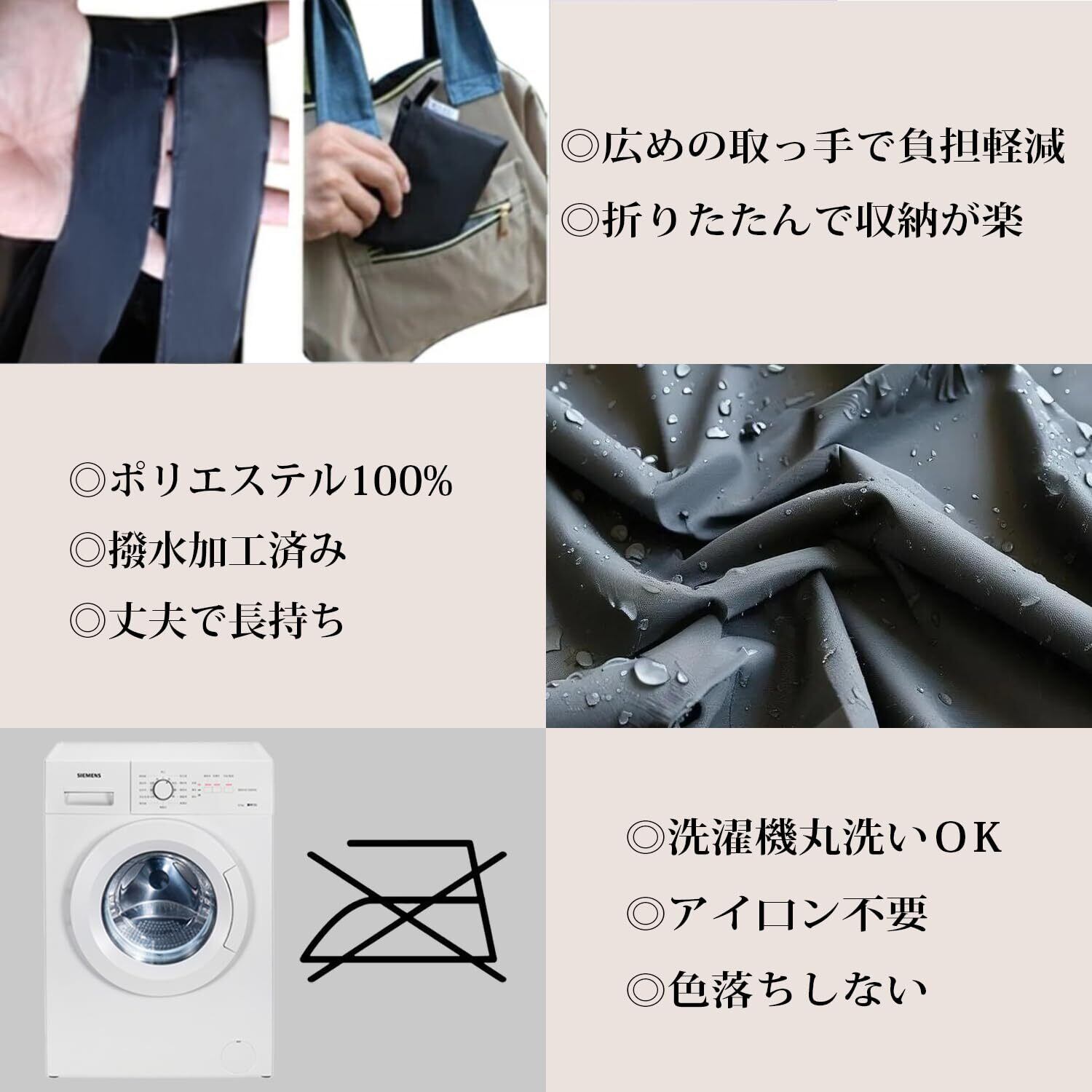 撥水、速乾、丈夫、しわになりにくい、軽量、洗濯可の優れたポリエステル素材を使用しております。気軽に携帯できるよう、折りたたみのサイズを最小限に工夫してあります。