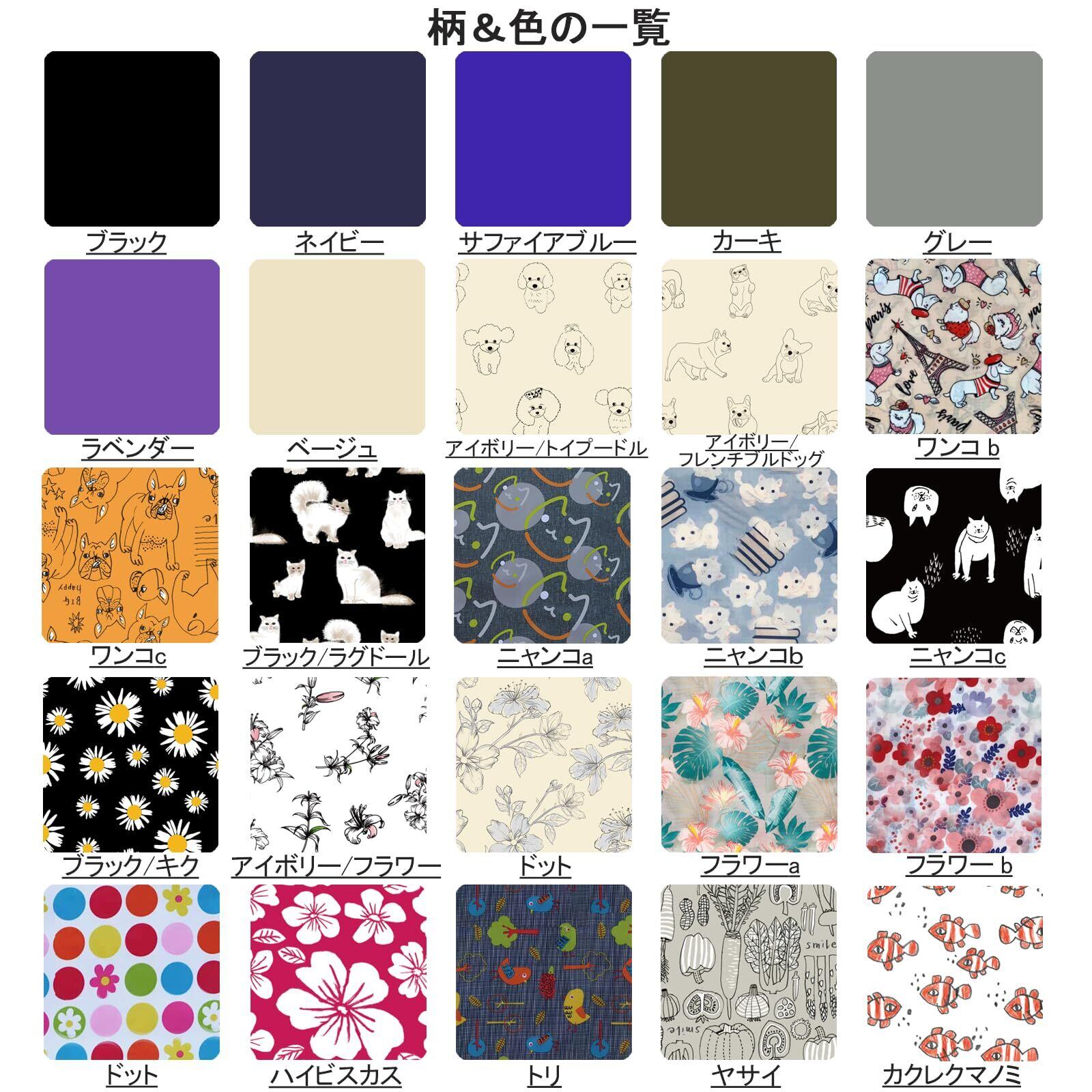 無地でベーシックなブラック、ベージュ、ネイビーに猫、犬、花、アニマルなど様々な柄からお選びいただけます。スーパーでの買い物だけなく、ショッピング、出張、旅行、お出かけ、アウトドアなどいろんなシチュエーションで男性も女性もご利用可能です。