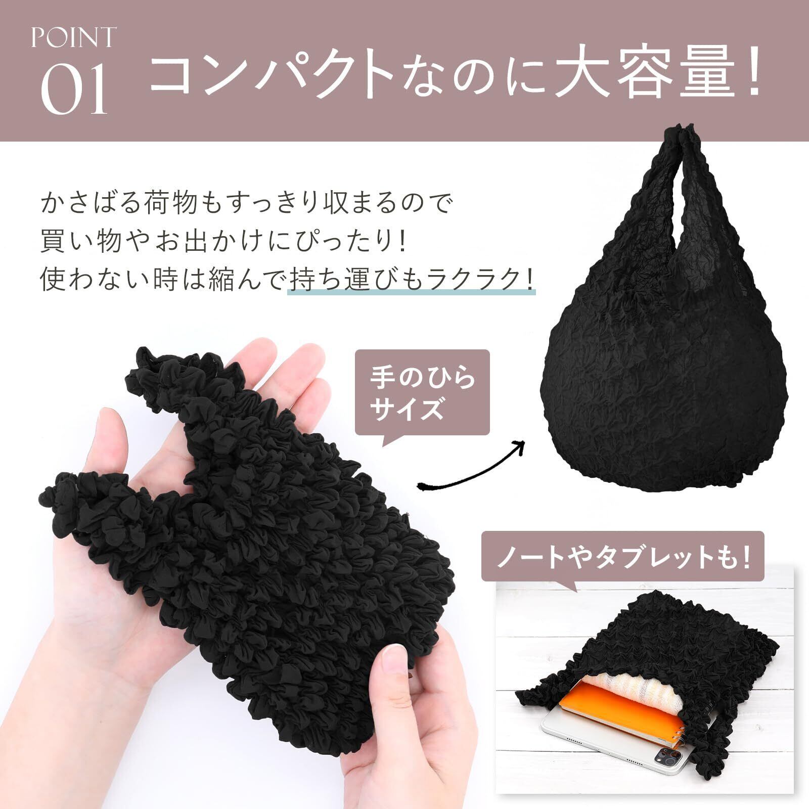 [Daction] ダクション くしゅくしゅ エコバッグ 小さめ 絞り おしゃれ 可愛い 縮む 伸びる 折り畳み 人気 コンパクト たたまない 黒 赤 青 緑 黄色