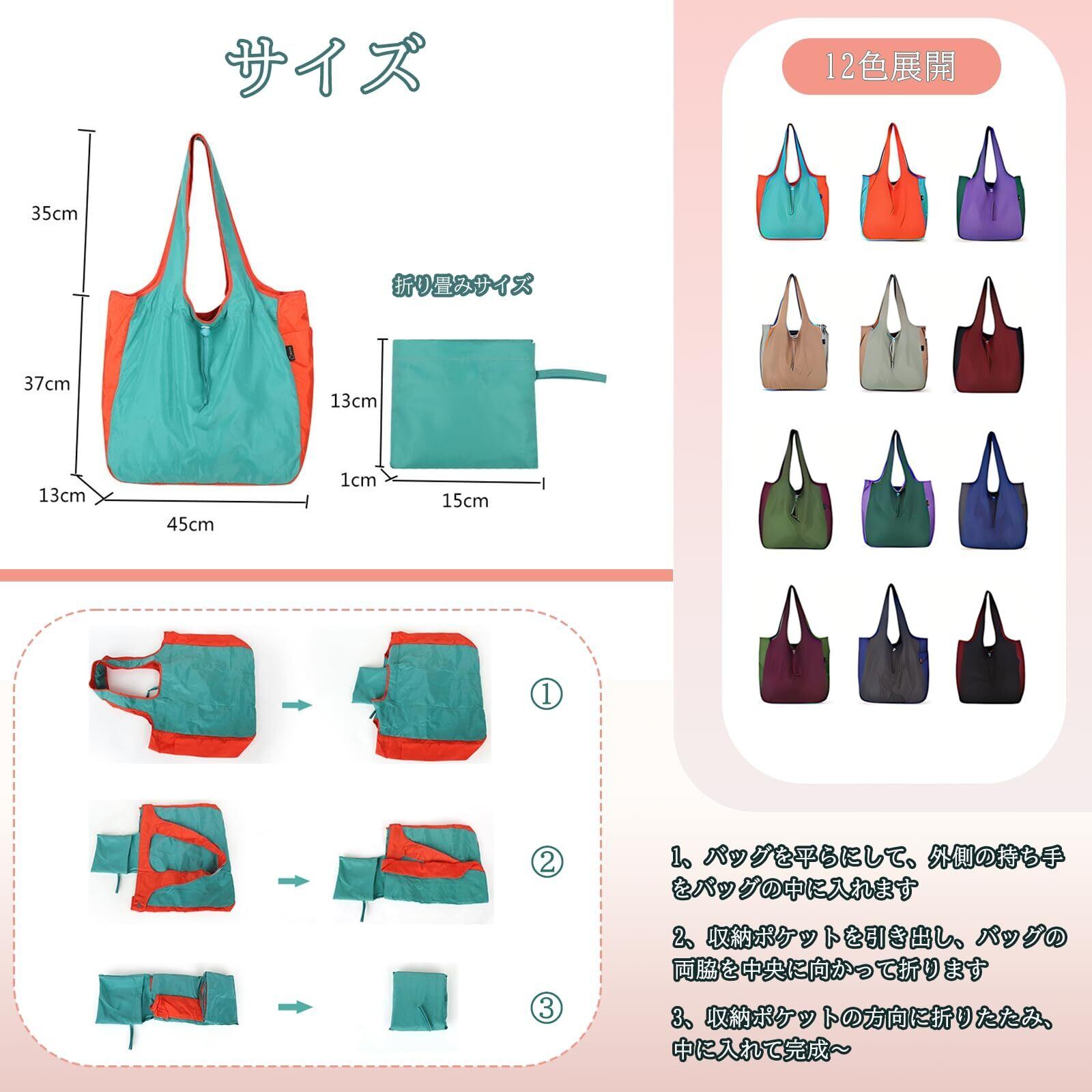 【豊富なカラー展開】選べる12色!色違いのご購入もおすすめです。オールシーズンで使えるエコバッグ!シンプルでおしゃれなデザイン、女性・男性ともご利用できます。コンビニ、スーパーでのお買い物はもちろんのことで、ピクニック、お出かけ、旅行などのシーンでもご活用頂けます。