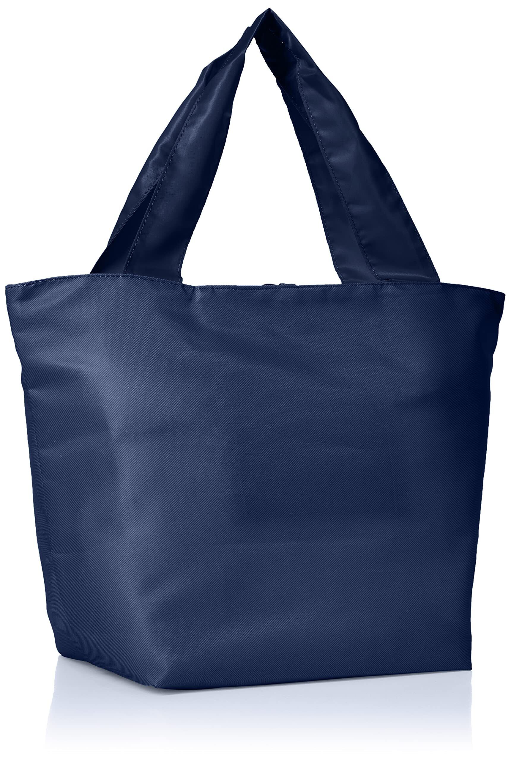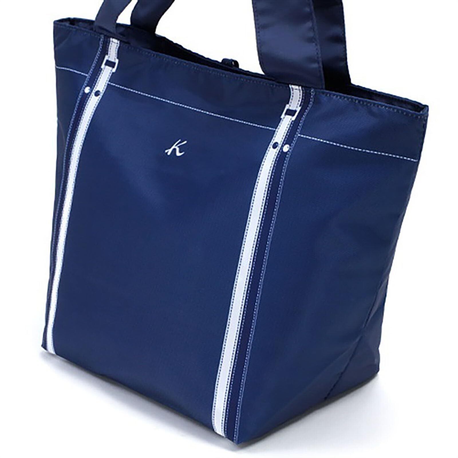 ダブルハンドルのデザインをプリントで表現した、だまし絵風の折りたたみバッグ。使いやすい舟形の形状で、収納力もあります。ファスナー付で口元がしっかり閉じられるのもポイント。縦に三つ折りし、下からクルクルと巻いてゴムで簡単にまとめることができます。