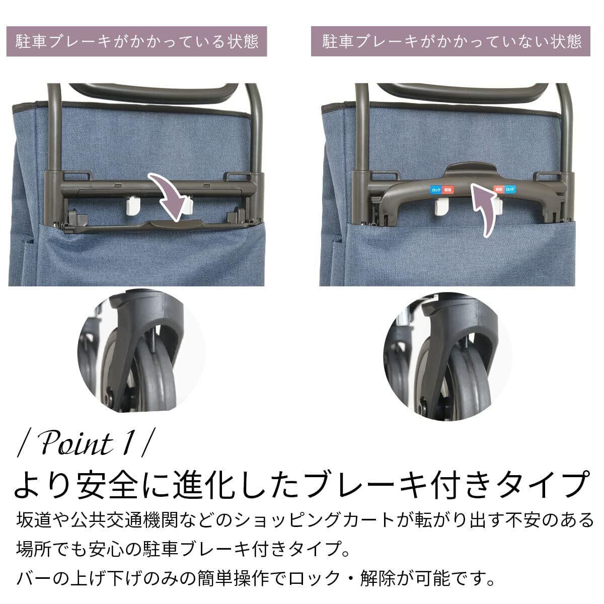 【より安全に進化したブレーキ付きタイプ】坂道や公共交通機関などのショッピングカートが転がり出す不安のある場所でも安心の駐車ブレーキ付きタイプ。バーの上げ下げのみの簡単操作でロック・解除が可能。背面にあるブレーキバーを下すと、車輪の溝にピンが下りて駐車ブレーキがかかり、ブレーキバーを上げると解除されます。バスや電車などでつり革・手すりにつかまりたい時や、スマホを確認したり少しショッピングカートから目を離す時でも勝手に転がる心配はありません。