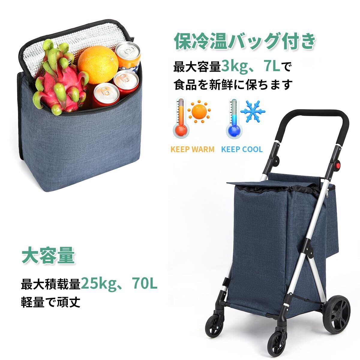 ショッピングカート 4輪 70L 買い物 カート 保冷 軽量 ショッピングキャリー 静音 折り畳み 安定 大容量 買い物 ピクニック 旅行に最適 高齢者 (ダークネイビー)