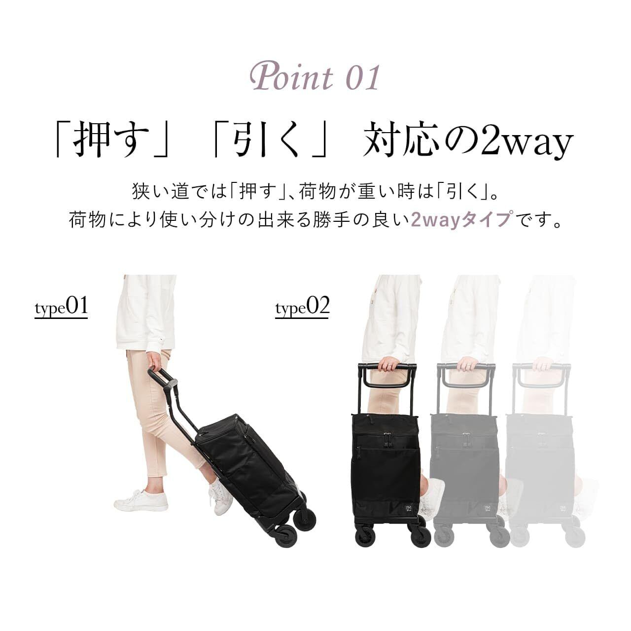 【いつものお買い物をもっと楽に】狭い道では「押す」、荷物が重いときは「引く」など路面の状況や、店内、公共交通機関など、様々なシーンに合わせて自分に合った楽な使用方法ができる2Wayタイプのショッピングカート。安定感のある4輪で、わずか2.4kgの軽量設計。「押す」「引く」使用時にハンドルを折り畳むことで2Wayが早変わり。自然に手を下ろした位置にハンドルが来るので、いつでも楽な姿勢でご使用いただけます。
