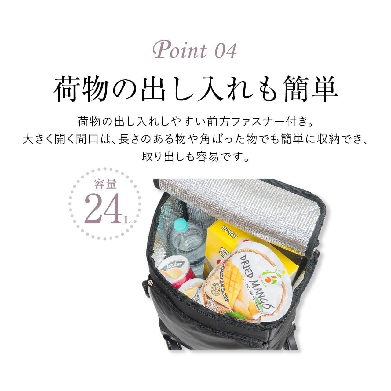 【もっと便利で安全なお買い物を】大容量で24Lまで収納可能なメインルームは荷物の出し入れがしやすい前方ファスナー付き。大きく開く間口は、長さのある物や角ばった物でも簡単に収納可能で、取り出しも容易です。さらに店内のカートへ取付可能なフック付きで、お買い物の邪魔にならず、移動もスムーズに行えます。また、カートを引くとキャスターに自動でロックがかかり、まっすぐ安定して走行することができるので、 荷物を運ぶ際にも安心です。