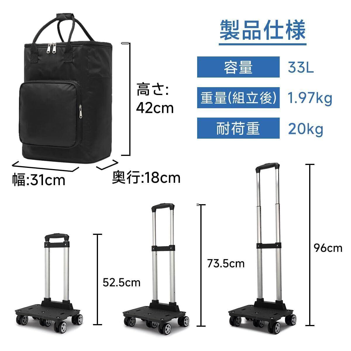 【サイズアップと大容量】33Lの大容量で、最大耐荷重50KGまで運可能。この新しい折り畳み式ショッピングカー市販されているものよりも6L大きく、より多く運ぶことができます。バッグの周りに3つのポケットがあり、傘、鍵、携帯電話、財布など多くのものを入れることができます。
