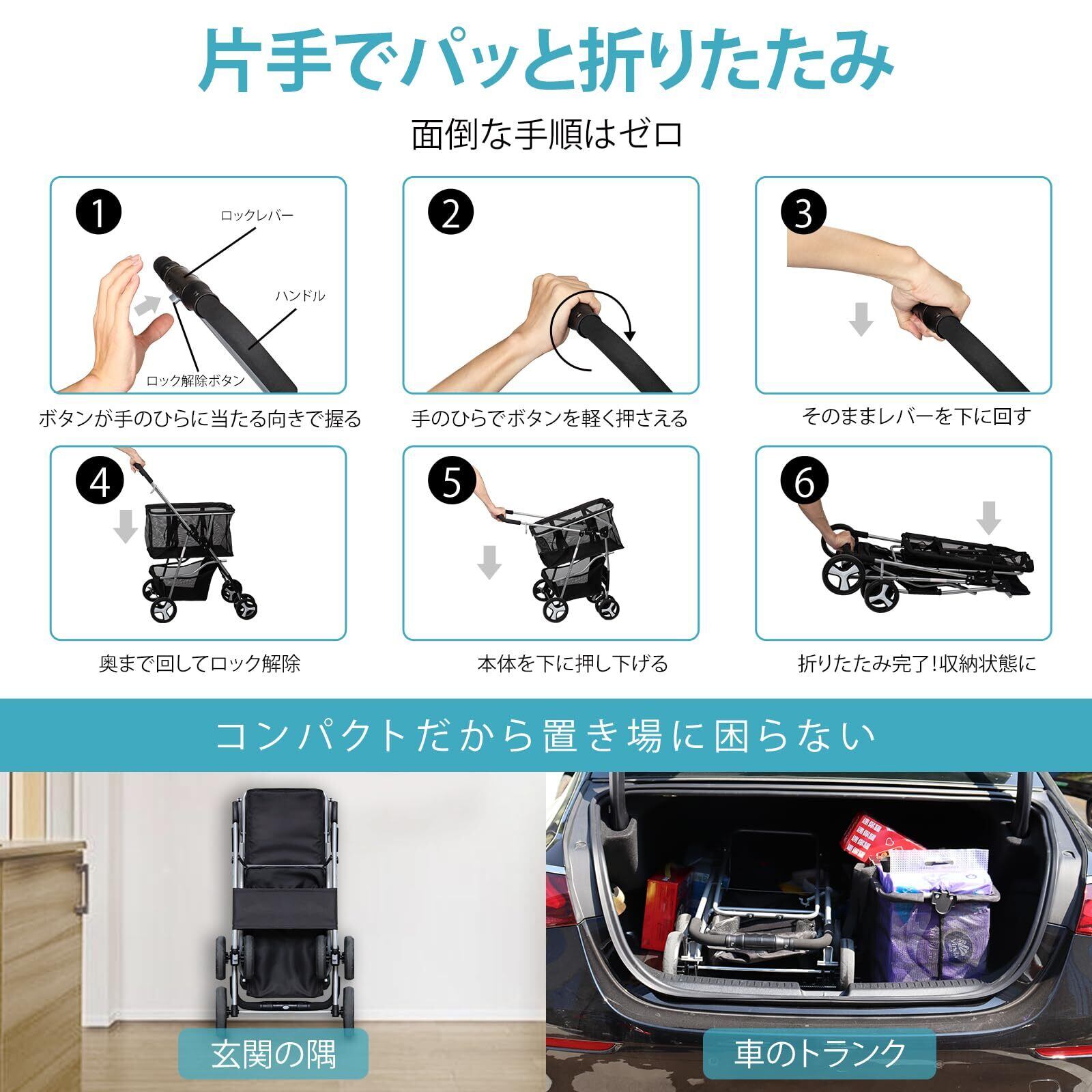 【片手で折りたたみ、コンパクト収納】レバーを握ってひねるだけの簡単操作。玄関やトランクのちょっとした隙間に収まり、持ち運びもラク。※折りたたみ操作にはコツがあり、数回の練習でスムーズになります。