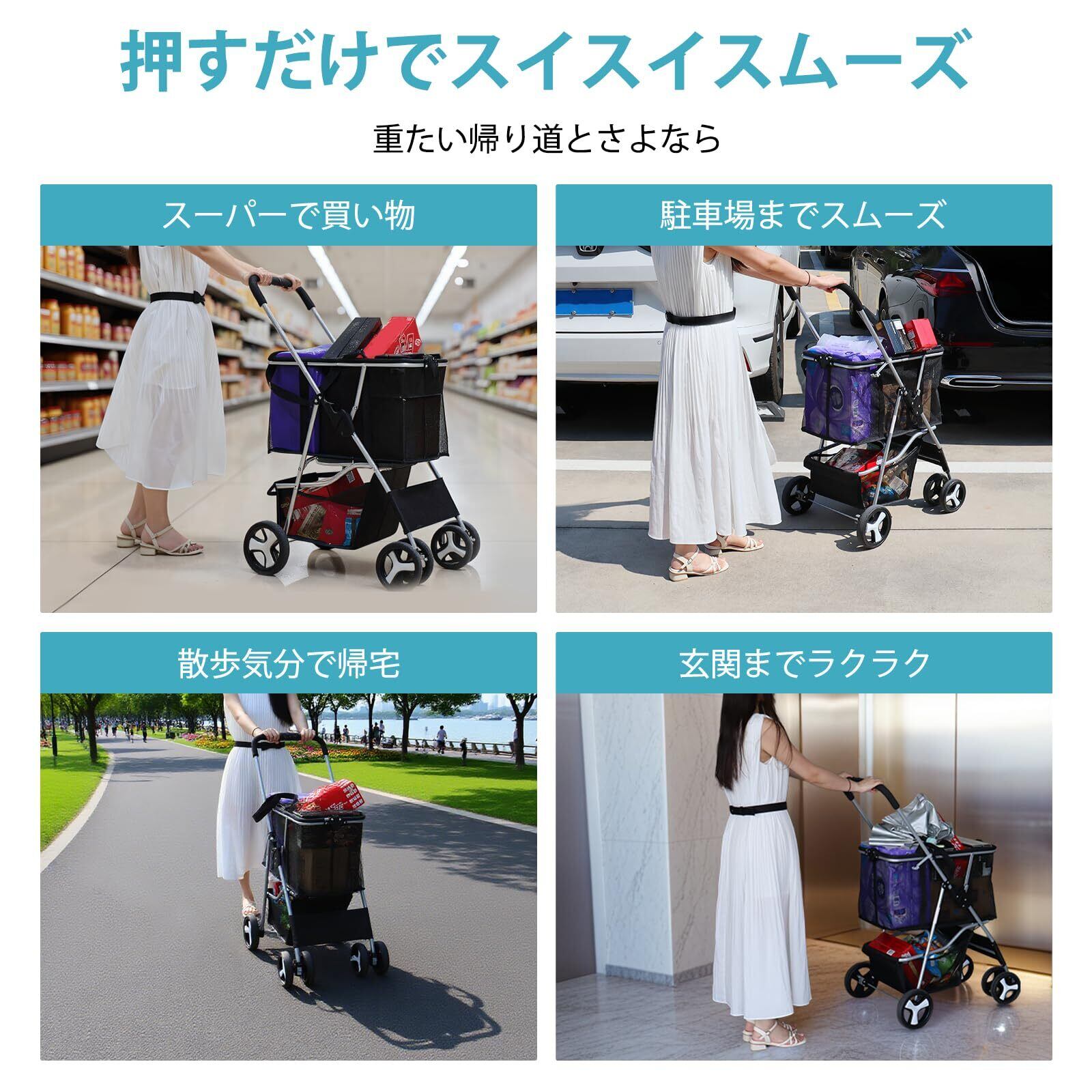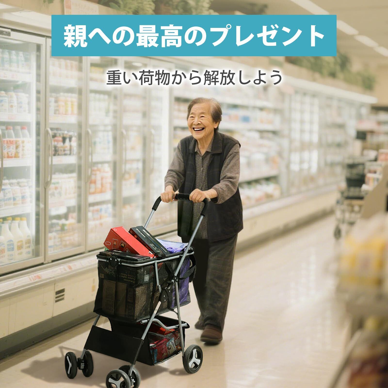 【週末のまとめ買いに最適】5kg米×2+2Lペット×12+箱ティッシュを目安に一度で運搬。舗装路での走行時は合計25kg程度を推奨し、段差は速度を落としてご使用ください。軽い力で押せて、ご高齢の方にも扱いやすい設計です。
