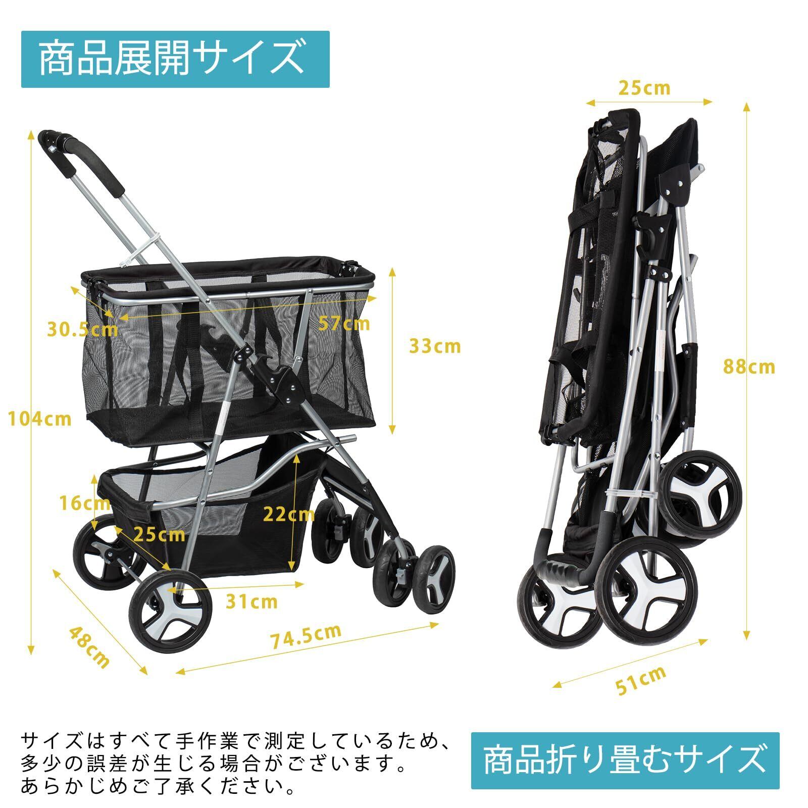 【仕様】使用時 約W48×D74.5×H104cm/折畳時 約W48×D89×H25cm、バッグ 約W30.5×D58×H31.5cm。重量 約4.7kg、上段25kg+下段5.5kg(いずれも静止時の目安)。アルミ+鉄フレーム/EVA静音タイヤ/54L着脱バッグ付。推奨身長150–178cm。※サイズは手作業計測のためわずかな誤差が生じる場合があります。