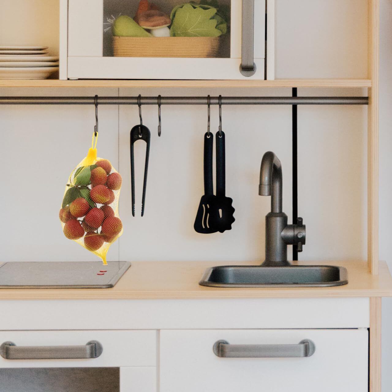 通気性に優れたメッシュデザイン:メッシュ生地の通気性により、食品の鮮度を保ち腐敗を防ぎ、食品ロス削減に貢献します。卵だけでなく果物や野菜の保存にも適しています。