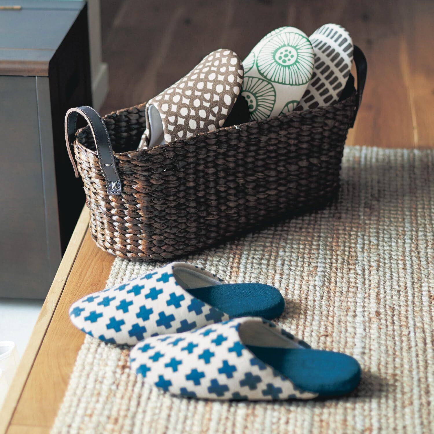 北欧調デザインの洗えるスリッパ4足セット 自然のモチーフをシックに描いた北欧風デザイン。足入れの良いやわらかな履き心地。裏面はパタパタ音がしにくい仕様。ご家族用にも、お客様用にもぜひどうぞ。洗濯機で洗えるから、いつも清潔に。