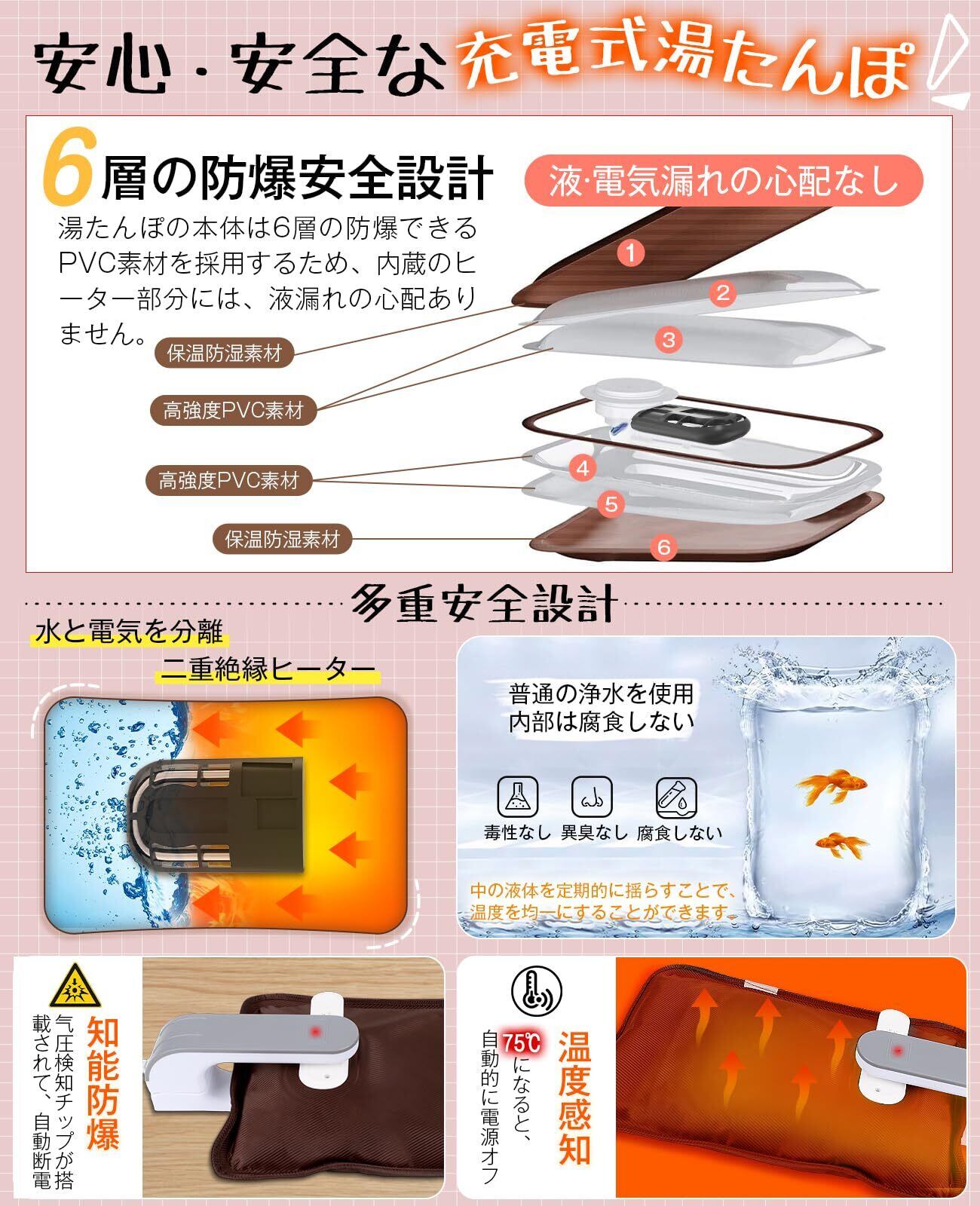 【高品質素材·6層防爆設計·自動断電】当湯たんぽはABS防火材を使用しており、異臭がなく、難燃性、耐熱性も強いです。水と電気の分離設計、腐食しない水を採用します。本体は6層構造になっているので水漏れの恐れがありません。温度過熱防止装置は二重保護チップでできており、湯たんぽの温度が75を超えると自動的に電源が切る安全設計です。同類品より耐久性が抜群です。