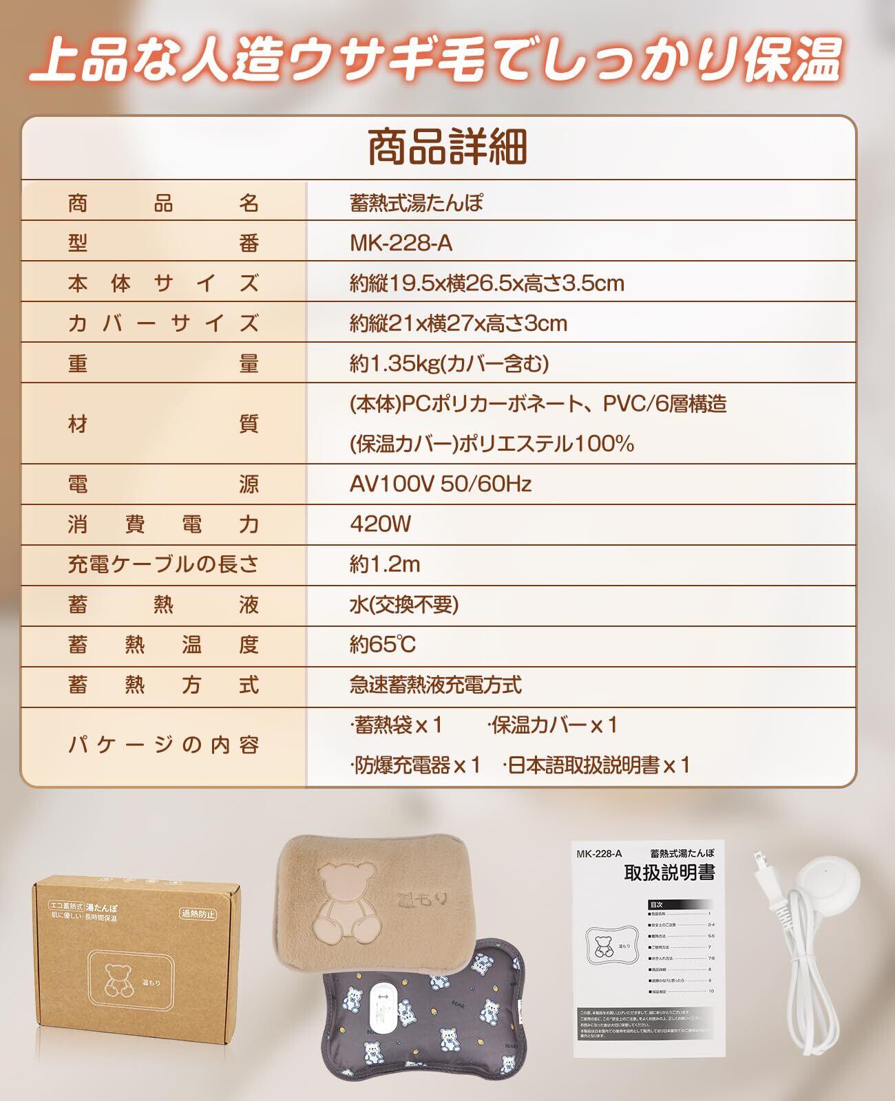 特徴 ①4~12H長時間保温 ②約8-12分急速充電 ③省エネ ④過熱防止機能 ⑤防爆充電器 ⑥人造ウサギ毛の保温カバー洗濯OK ⑦27x21cm